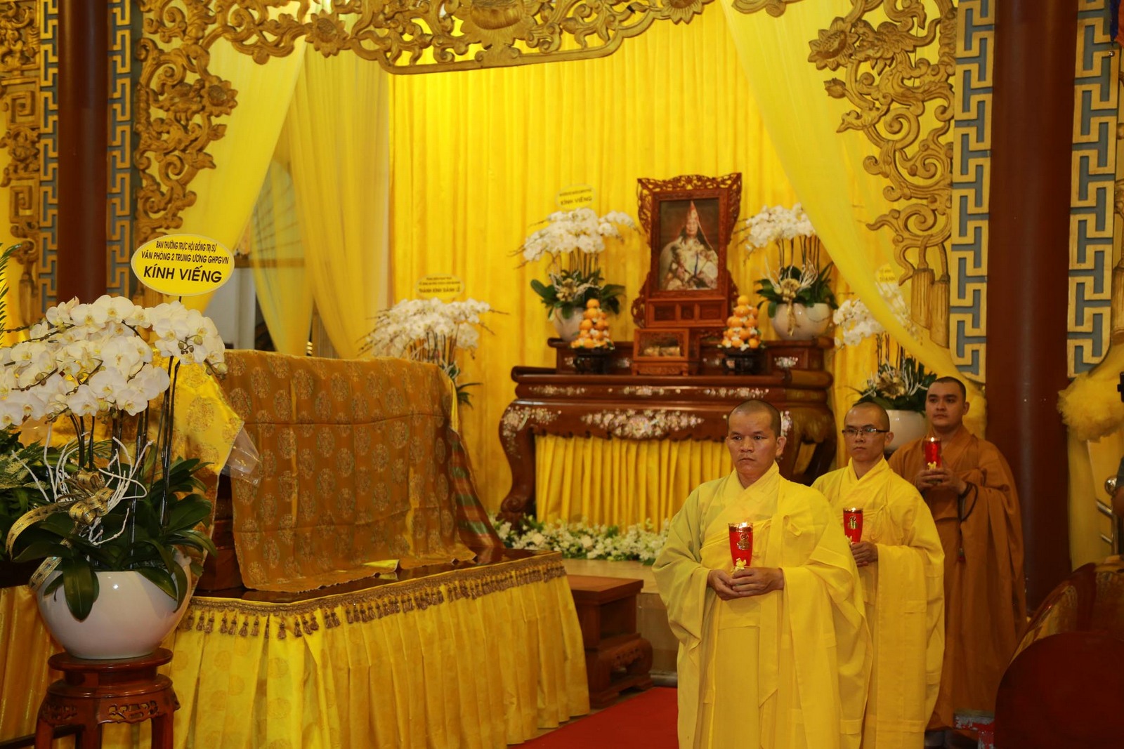 Chư tôn đức Hòa thượng chứng minh niệm hương kính lễ tam bảo, tiến hành nghi thức sái, niệm kinh tiếp dẫn.Theo đó, môn đồ pháp quyến cung kính đưa nhục thân của cố HT.Thích Viên Giác nhập kim quan, thiết lập linh đường, an trí trang nghiêm tại chùa Giác Huệ, phường Tân Thuận Đông, Quận 7, Tp. Hồ Chí Minh.