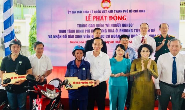 Sáng 8/10, Ủy ban MTTQ Việt Nam TP – Ban vận động, tiếp nhận và quản lý Quỹ “Vì người nghèo” TPHCM tổ chức lễ phát động hưởng ứng Tháng cao điểm “Vì người nghèo”; trao tặng kinh phí xây dựng nhà ở, phương tiện sinh kế và nhận đỡ đầu các sinh viên đại học có hoàn cảnh khó khăn vượt khó học giỏi trên địa bàn TPHCM.