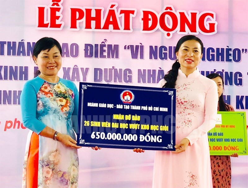 Phó Chủ tịch Ủy ban MTTQ Việt Nam TP Phan Kiều Thanh Hương tiếp nhận từ Công đoàn ngành Giáo dục và Đào tạo TP nhận đỡ đầu 26 sinh viên đại học vượt khó với kinh phí 650 triệu đồng.