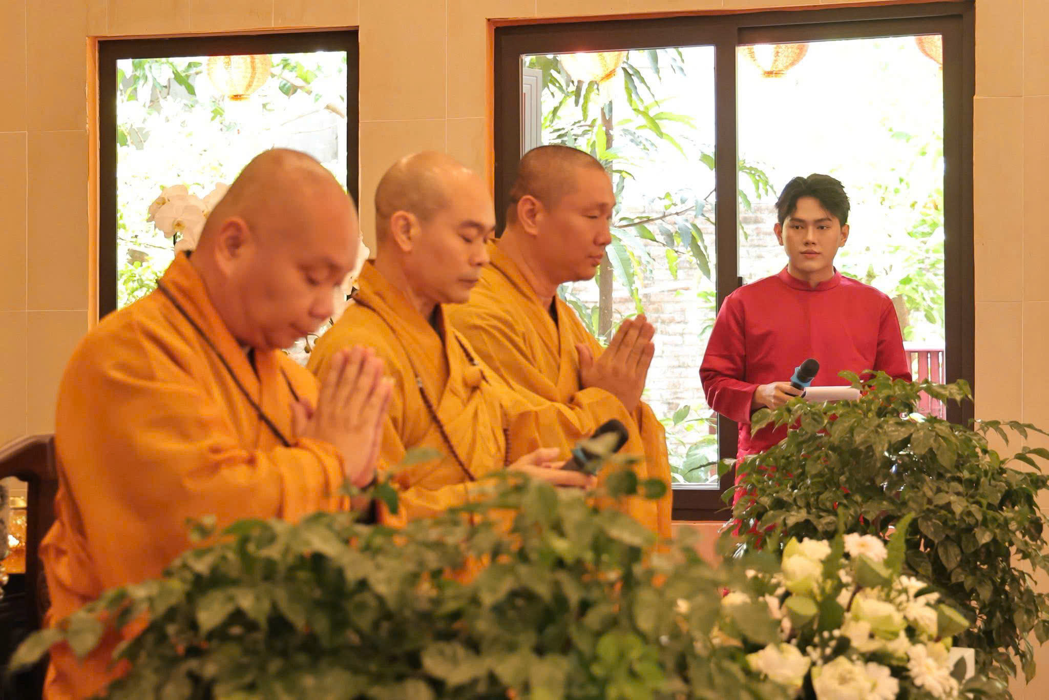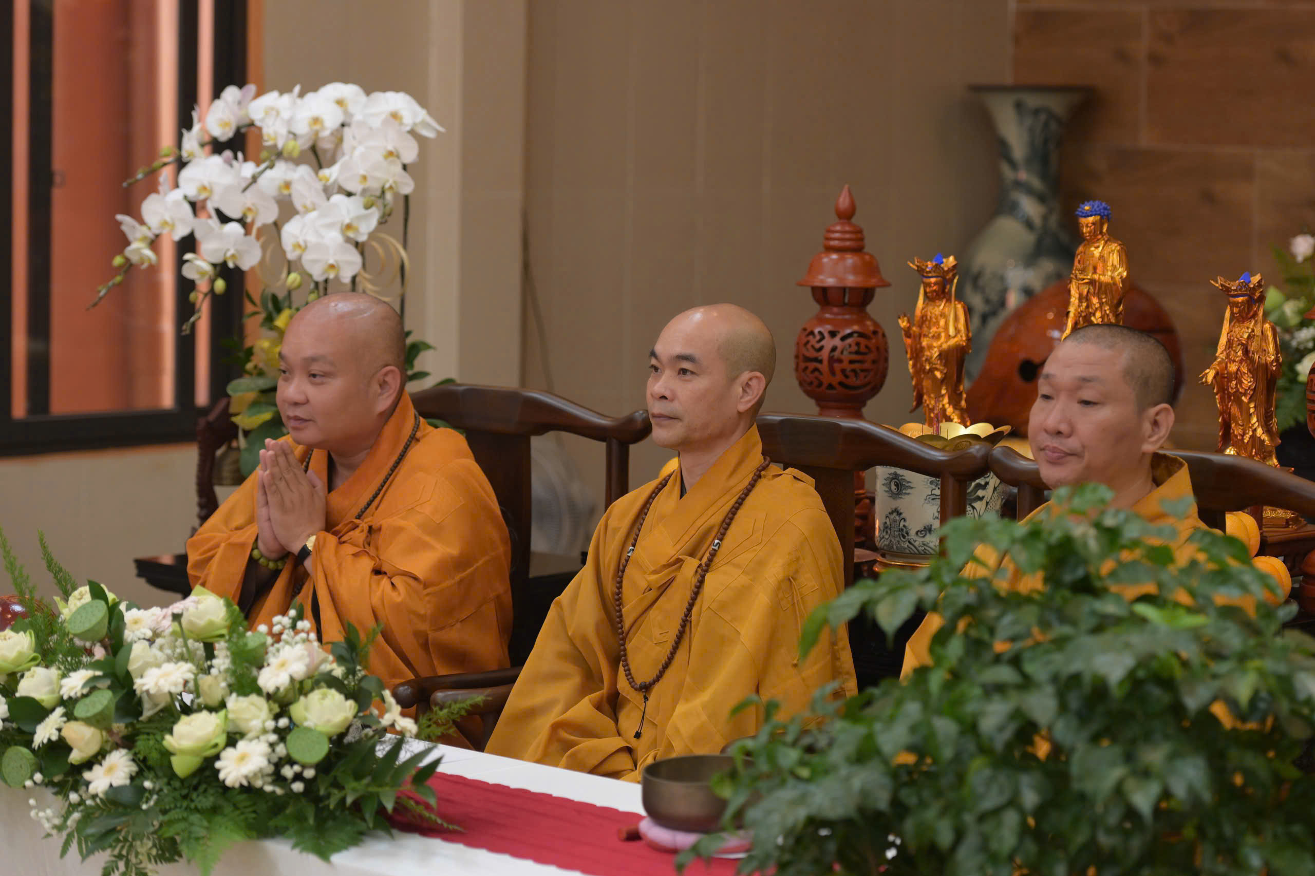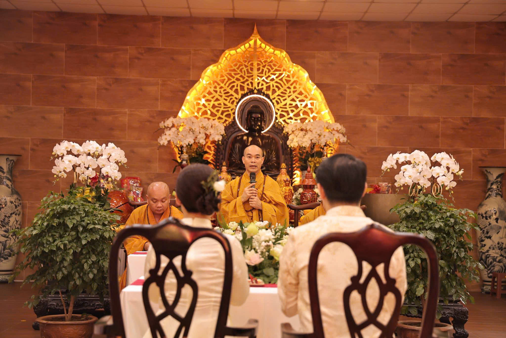 Nhân dịp này, Thượng tọa Thích Trung Nguyện đã ban lời chúc phúc đến đôi bạn trẻ. Chư Tôn đức cũng trao chứng nhận Hằng thuận, tặng hoa và quà chúc mừng, gửi gắm niềm tin và lời chúc tốt đẹp đến đôi uyên ương trên chặng đường xây dựng đời sống hôn nhân bền vững, an vui.