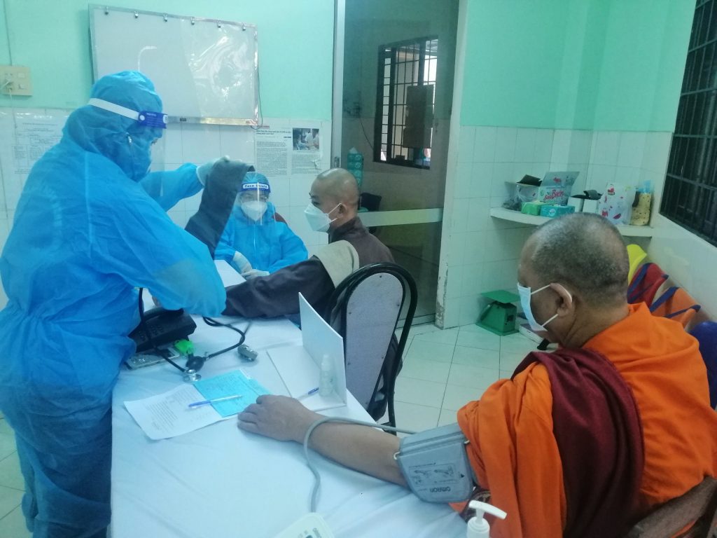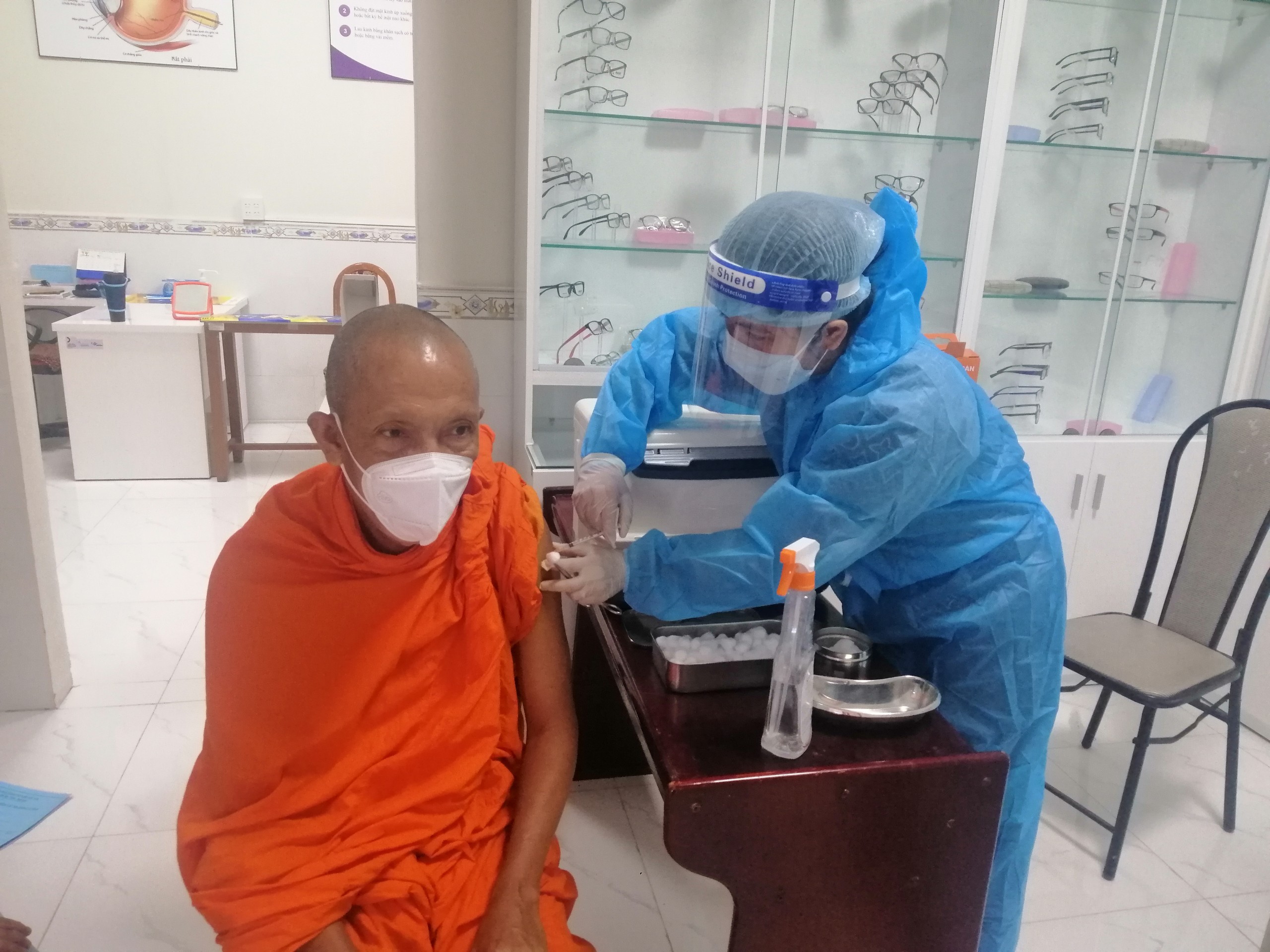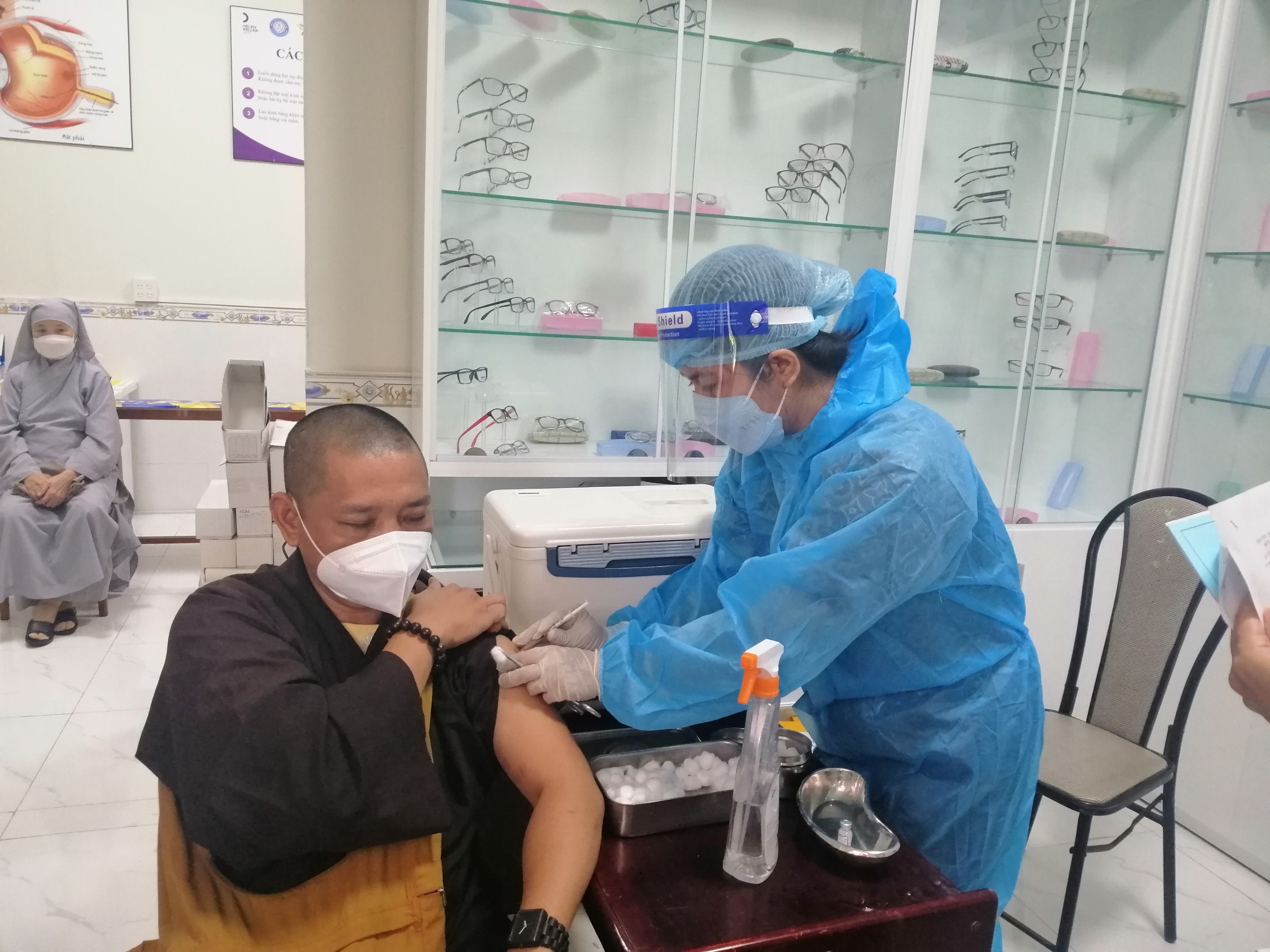 Các vị chức sắc tôn giáo được khám sàng lọc kỹ lưỡng trước khi tiêm, theo dõi phản ứng sau tiêm và được hướng dẫn theo dõi sức khỏe tại nhà chùa. Vắc xin được tiêm là vắc xin ComirNaty.