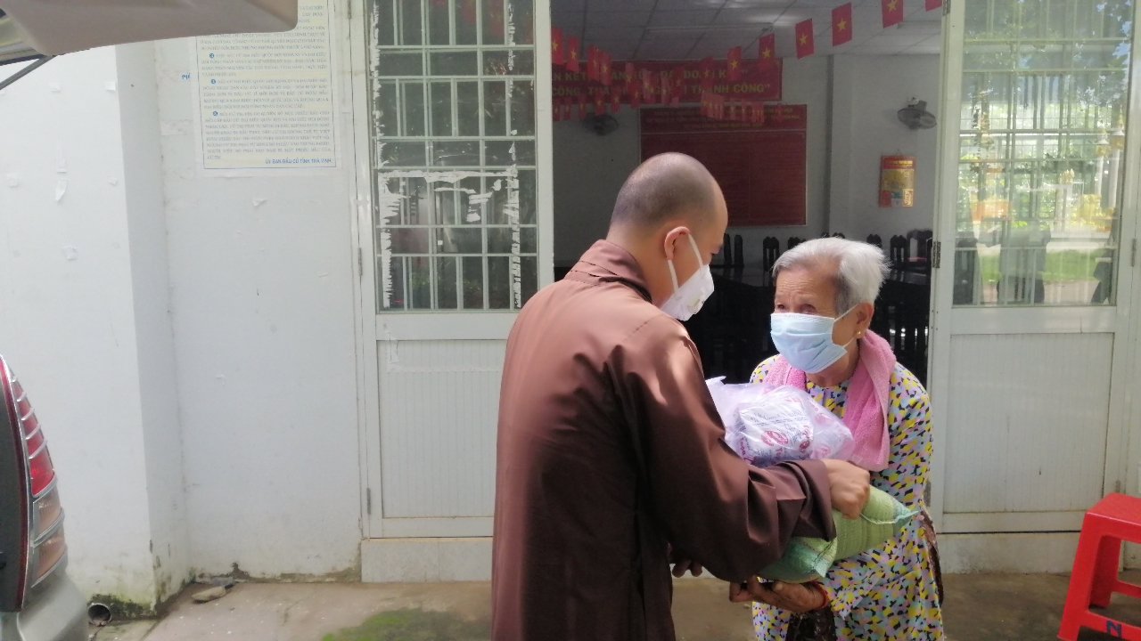 Đại đức Thích Huệ Chiếu – Trưởng ban Kinh tế tài chính, BTS GHPGVN tỉnh Trà Vinh, Trụ trì chùa Long Khánh, phường 3. Tp.Trà Vinh, tỉnh Trà Vinh kết hợp cùng Chính quyền địa phương có Ông Sơn Ngọc Minh, Trưởng Ban công tác Mặt Trận ấp Bình La, xã Lương Hòa,huyện Châu Thành, Ông Võ Văn Bửu ,Đảng uỷ viên, Chủ tịch Hội nông dân phường 7,  Ông Nguyễn Thanh Hùng, phó Bí thư thường trực Đảng uỷ phường 5 tổ chức  trao tặng 47 phần quà cho các hộ dân khu phong toả cách ly y tế thuộc ấp Bình La, xã Lương Hòa,huyện Châu Thành tỉnh Trà Vinh và các hộ nghèo gặp khó khăn do dịch bệnh covid 19 tại phường 7 và phường 5 thành phố Trà Vinh tỉnh Trà Vinh.