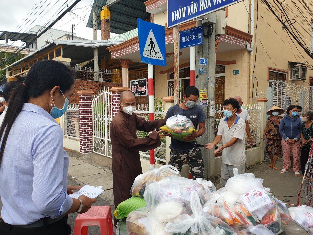 Ngày 26/10, chùa Long Khánh tặng 130 phần quà cho các hộ dân khu phong toả cách ly y tế do dịch bệnh covid 19 trên địa phường 5 TPTV