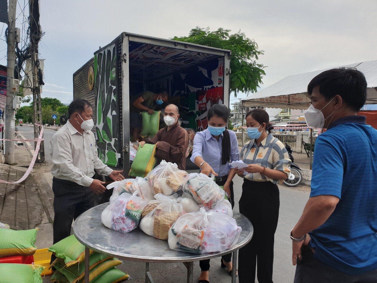 Nhằm kịp thời hỗ trợ phần nào khó khăn cho người dân khu vực phong toả cách ly y tế , nhất là thời điểm dịch bệnh Covid 19 còn đang diễn biến phức tạp. Ngày 26/10 Đại đức Thích Huệ Chiếu – Trưởng ban Kinh tế tài chính, BTS GHPGVN tỉnh Trà Vinh, Trụ trì chùa Long Khánh, phường 3. Tp.Trà Vinh, tỉnh Trà Vinh kết hợp cùng với Đảng uỷ, UBND, Uỷ ban mặt trận tổ quốc Việt Nam phường 5 thành phố Trà Vinh, tỉnh Trà Vinh có Ông Nguyễn Thanh Hùng, phó bí thư thường trực đảng uỷ phường 5 đến trao 130 phần quà cho 130 hộ dân khóm 3 phường 5 đang thực hiện phong toả cách ly y tế phòng chống covid 19.