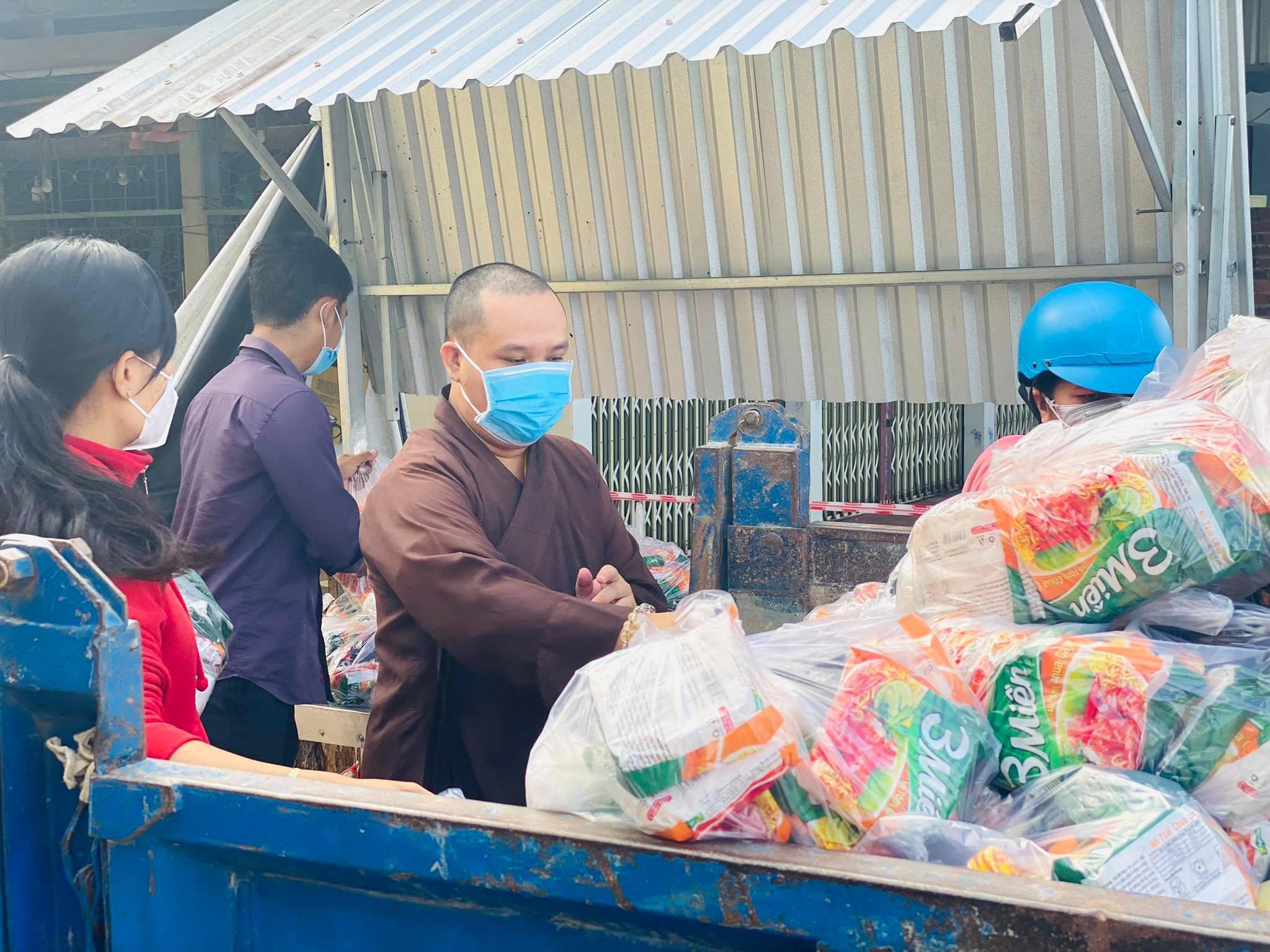 Mỗi phần quà gồm: gạo, mì gói, trứng và vật phẩm thiết yếu gia đình do bà con phật tử chùa Long Phước đóng góp.