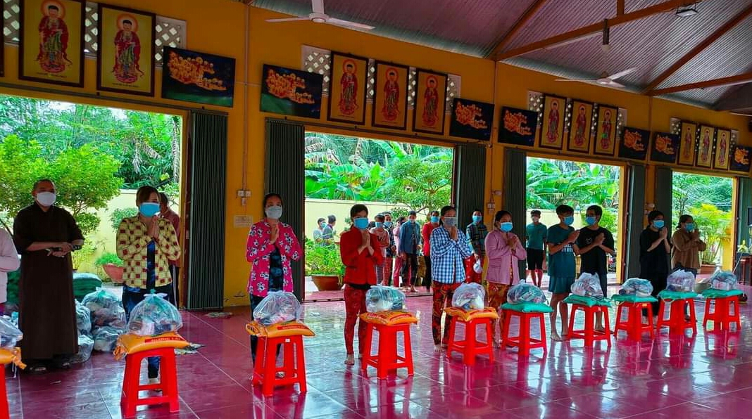 Bà con đến nhận quà thực hiện tốt thông Điệp 5K, phấn khởi gửi lời cám ơn đến chùa và nhà hảo tâm gần xa. Với những hoạt động ý nghĩa này, sẽ là nguồn động viên tinh thần giúp bà con phần nào và sớm vượt qua khó khăn trong cuộc sống.