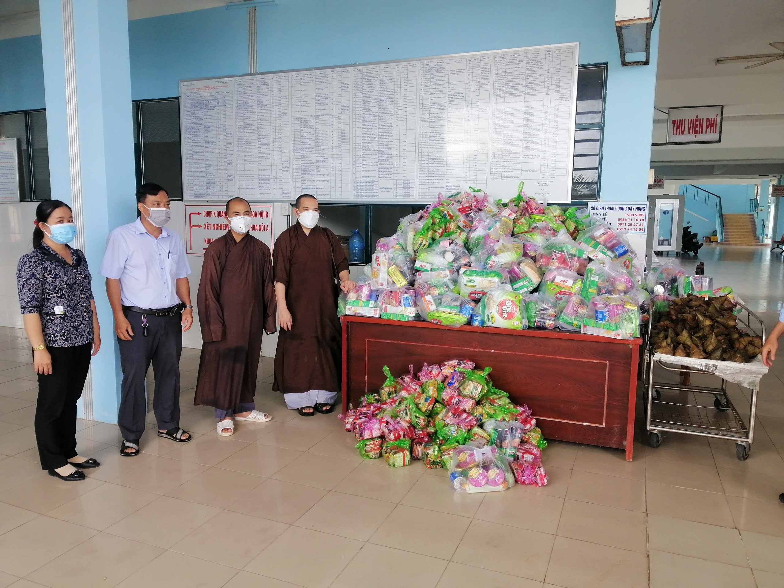 Chư Đại Đức đã ân cần thăm hỏi sức khoẻ lực lượng, cán bộ quản lý, đội ngũ y bác sỹ bệnh viện đồng thời động viên thực hiện tốt nhiệm vụ của mình, nhất là việc theo dõi và điều trị cho các bệnh nhân covid 19.Nhân đây đoàn đã trao 105 phần quà gồm: mì, bánh, sữa và các đồ dùng thiết yếu cho cuộc sống, Tổng kinh phí trao quà trên 20 triệu đồng do bà con phật tử chùa Phật Bửu, ấp Lưu Tư ,xã Huyền Hội, huyện Càng Long  và chùa Long Khánh, phường 3. Tp.Trà Vinh đóng góp