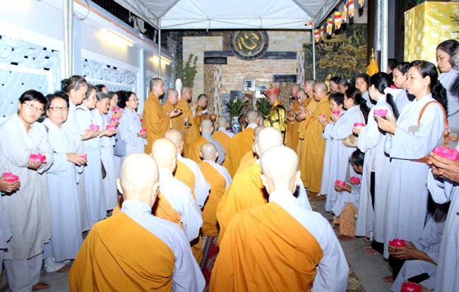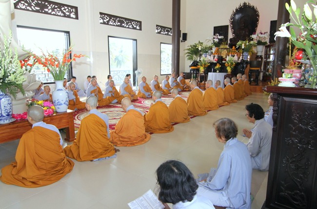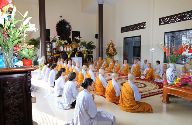 Mừng Phật sự thành tựu viên mãn, giờ đây trước Trai đường trang nghiêm, toàn thể Ni chúng cung kính tỏ lòng hoan hỷ cung đón Chư tôn đức Tăng Ni thân lâm về đây chứng minh Pháp sự. NS TN Tịnh Nghiêm  – Tọa chủ Ni viện Tịnh Nghiêm vô cùng xúc động,ngẹn ngào, với một chút hoài niệm thiêng liêng khi dâng lên đôi lời cảm niệm tri ân đối với hiện tiền Chư tôn đức Tăng già nhị bộ. Ni sư tâm sự “Được đại lao quý Ni trưởng, được đở nhọc cho Chư Ni, được làm ít nhiều phật sựdo Giáo hội giao phó…đó là niềm hạnh phúc lớn lao nhất của chúng con.
