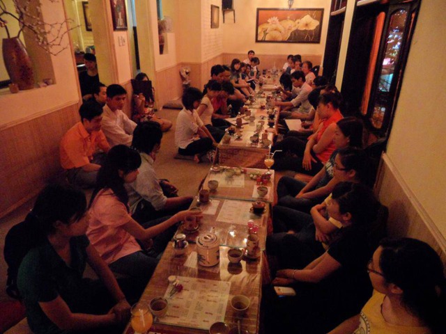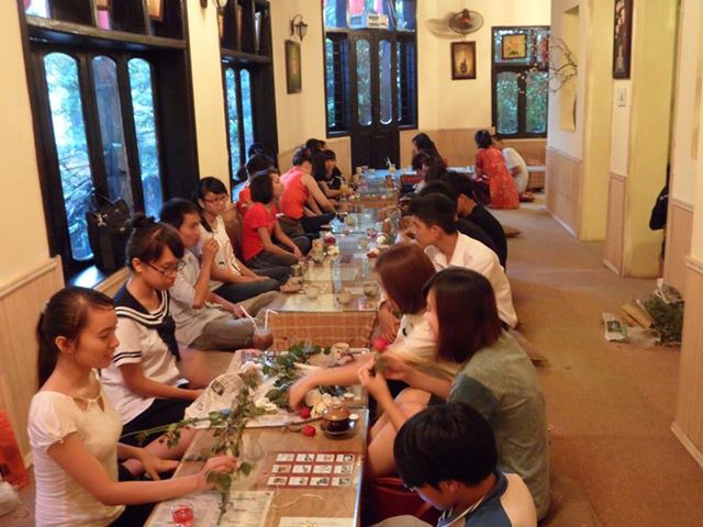 Không gian trầm mặc của Trà hoa quán, dưới ánh đèn điện đỏ ấm áp, trên tường rải rác những bức tranh mang bản sắc văn hóa, những chiếc bàn thấp, đệm ngồi và gối ôm tất cả đều mang màu sắc trầm để những người đến nơi đây được hoàn toàn thả trôi dòng cảm xúc của mình bằng một nhịp sống trầm lắng nhất.Chúng tôi ngồi gần nhau, bên nhau, chung 1 nhịp đập. Thật ấm áp và gần gũi.