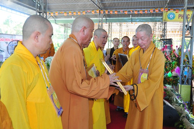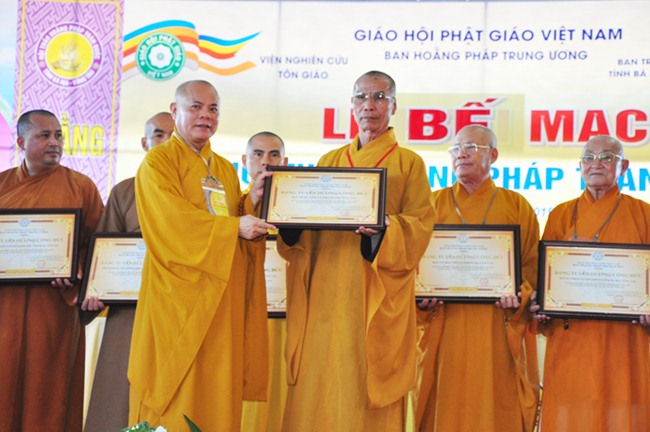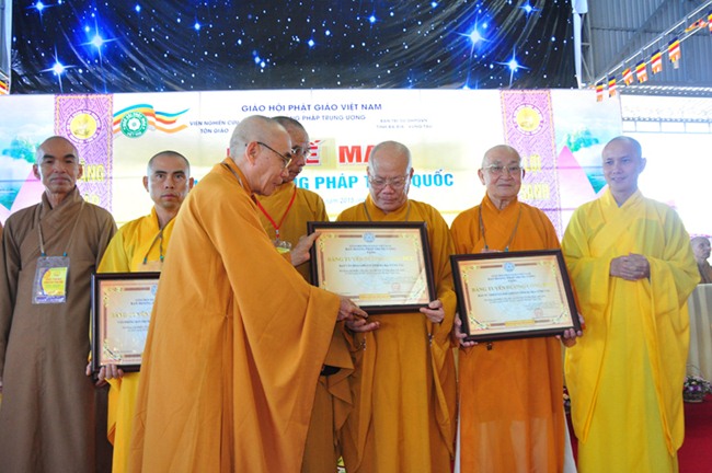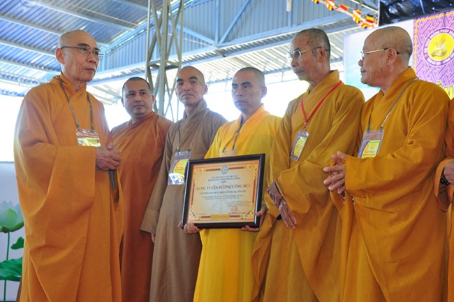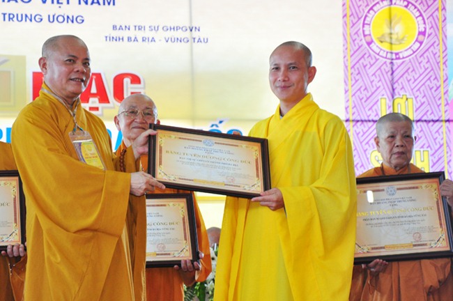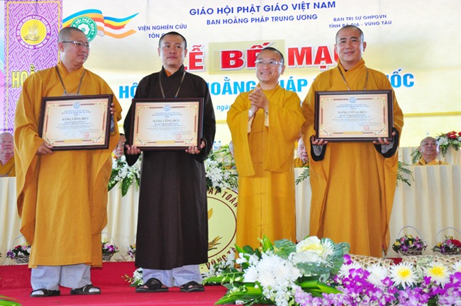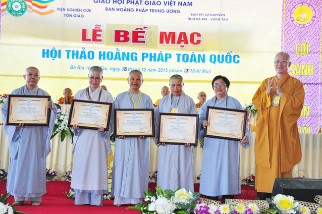 Kế tiếp, TT Thích Huệ Thông, thay mặt Ban Thường trực HĐTS thông qua quyết định tặng bằng tuyên dương công đức (cho tập thể BTS GHPGVN tỉnh Bà Rịa Vũng Tàu, tập thể Ban Hoằng pháp GHPGVN tỉnh BRVT, HT Thích Quảng Hiển-Trưởng Ban Trị Sự GHPGVN tỉnh BRVT, HT Thích Giác Hạnh-Phó Trưởng Ban kiêm Trưởng Ban Hoằng pháp GHPGVN tỉnh BRVT, ĐĐ Thích Thiện Thuận-Phó Thư ký kiêm Chánh văn phòng BTS GHPGVN tỉnh BRVT; bằng công đức (cho NT TN Như Như-Phó Trưởng Ban Trị sự GHPGVN tỉnh BRVT, ĐĐ Thích Nhuận Nghĩa-Chánh Thư ký BTS GHPGVN tỉnh BRVT, ĐĐ Thích Thiện Thông-Trưởng Ban HDPT GHPGVN tỉnh BRVT, Phật tử Trần Thị Thanh Nga (pháp danh Diệu Tín)-Phó Ban vận động tài chính Hội thảo) của GHPGVN cho Ban tổ chức hội thảo; HT Thích Trí Quảng-Phó Pháp chủ HĐCM, Phó Chủ tịch HĐTS, Chứng minh Ban Hoằng Pháp TƯ trao tặng bằng tuyên dương công đức và bằng công đức cho cá nhân và tập thể trên.