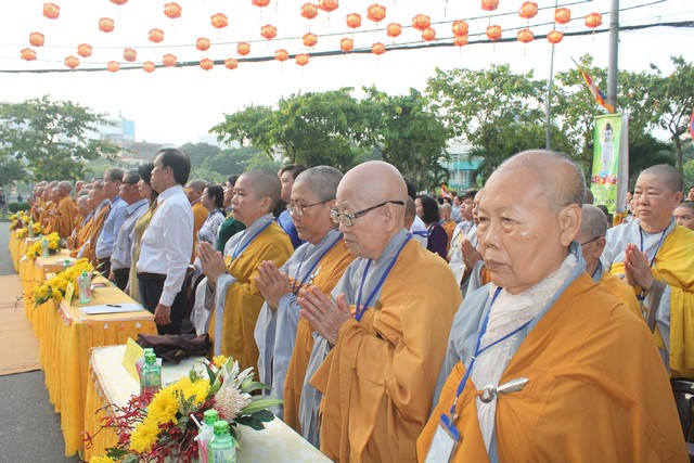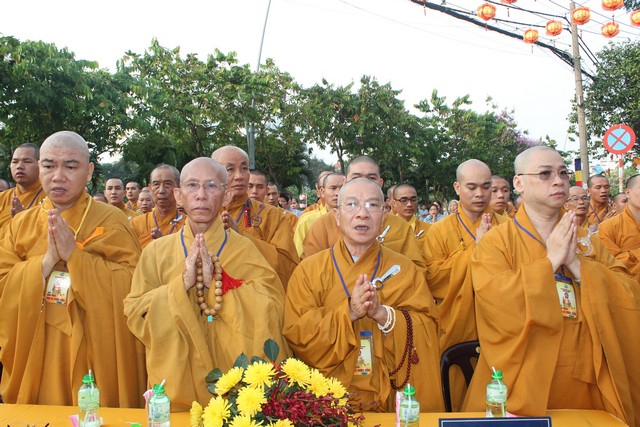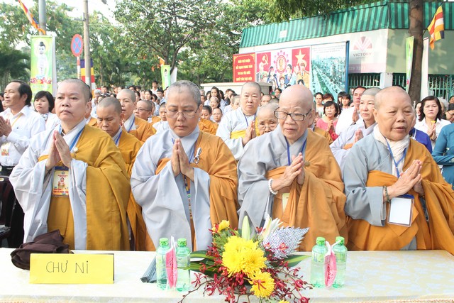 Mở đầu chương trình chào mừng đại lễ PD.2561 – DL.2017, tứ chúng trang nghiêm chào quốc kì, chào đạo kì biểu trưng cho ngũ căn ngũ lực và lý tưởng giác ngộ giải thoát của giáo lý Đức Phật – phút nhập từ bi quán hướng về ngày đản sinh đức Từ Phụ Thích Ca Mâu Ni, tưởng niệm công đức của chư vị tiền bối hữu công PGVN, tưởng nhớ công lao của Chủ tịch Hồ Chí Minh, chư vị anh hùng dân tộc đã nằm xuống cho Tổ Quốc và Đạo Pháp mãi trường tồn.