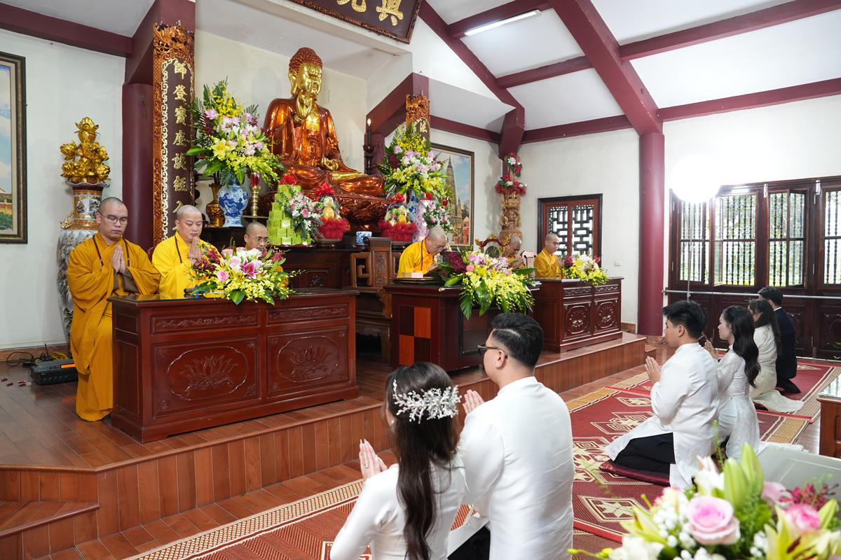 Cuối buổi lễ, Hòa thượng trụ trì cùng chư tôn đức và toàn thể đại chúng đã làm lễ chúc phúc cho ba đôi trẻ “trăm năm tình viên mãn, bạc đầu nghĩa phu thê”.