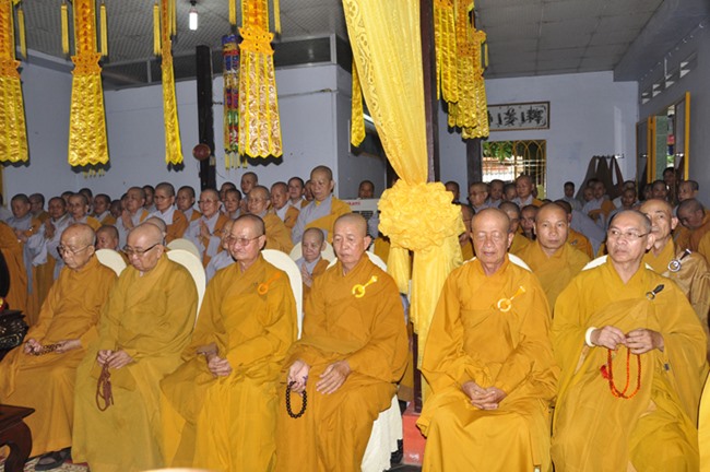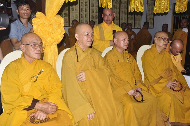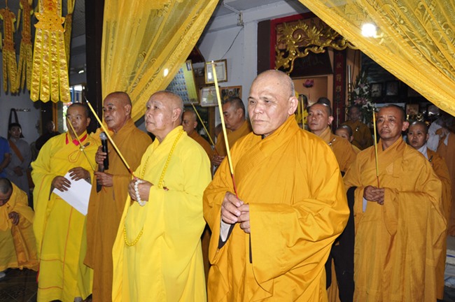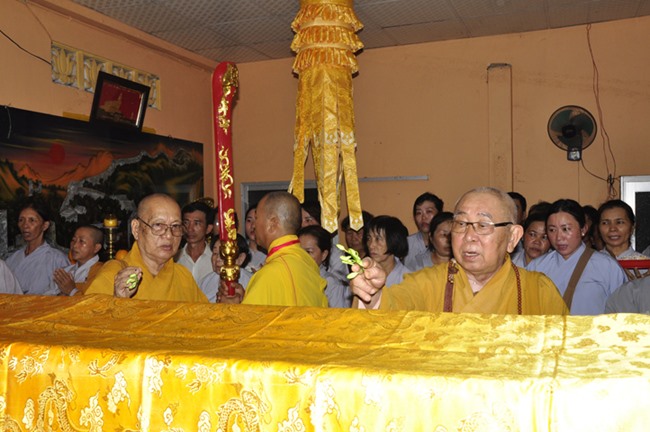 Tại Giác linh đài, trước sự chứng minh của chư Tôn đức, ĐĐ. Thích Lệ Trí – Chánh Thư ký Ban Trị sự GHPGVN tỉnh Long An kính tuyên công đức của cố Hòa thượng đã đồng hành góp phần trang nghiêm Giáo hội tỉnh nhà trong những thập niên qua. Tiếp theo, Đại đức cung thỉnh chư Tôn đức Giáo phẩm niêm hương, sái tịnh đàn tràng. Trong tiếng trống trầm hùng vang dội, môn nhân pháp quyến phụng thỉnh Nhục thân cố Hòa thượng nhập kim quan.