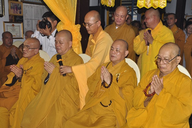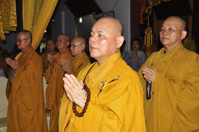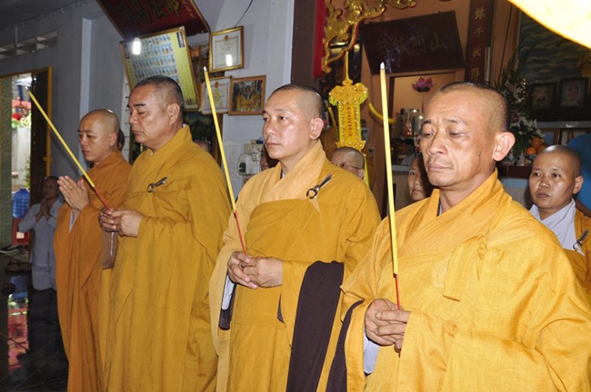 Đúng 13g, Ban nghi lễ cùng môn nhân pháp quyến vân tập tại phương trượng bạch thỉnh chư Tôn đức Giáo phẩm Ban Trị sự Phật giáo Thành hội: HT. Thích Thiện Tánh – Phó Chủ tịch HĐTS kiêm trưởng Ban pháp Kiểm soát GHPGVN; HT. Thích Tấn Đạt- Ủy viên thường trực HĐTSTƯ,Phó văn phòng 2 trung ương, Phó thường trực ban Hoằng pháp GHPGVN; HT.Thích Giác Liêm, Phó Chánh Văn phòng 2 T.Ư GHPGVN; HT.Thích Tịnh Hạnh – Phó ban Trị sự GHPGVN Tp. HCM ; HT. Thích Như Tín-Phó Ban trị sự kim Trưởng trưởng ban Kiểm soát GHPGVN thành phố HCM chư Tôn đức Giáo phẩm tỉnh Long An: HT. Thích Minh Thiện – Ủy viên HĐTS, Phó trưởng Ban Hoằng pháp TW, Trưởng Ban Trị sự GHPGVN tỉnh Long An; HT. Thích Huệ Bạch – Trưởng Ban Trị sự GHPGVN huyện Cần Giuộc; chư Tôn đức Tông phong Thiên Thai: HT. Thích Tắc Lãnh; HT. Thích Tắc Phi; HT. Thích Tắc Nhàn cùng chư Tôn đức Tăng Ni trụ trì các tự viện huyện thị trực thuộc tỉnh Long An quang lâm Giác linh đài chứng minh nghi thức nhập kim quan Cố Hòa thượng Thích Tắc Trụ.