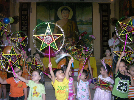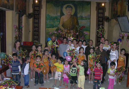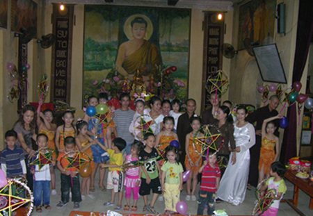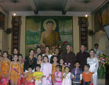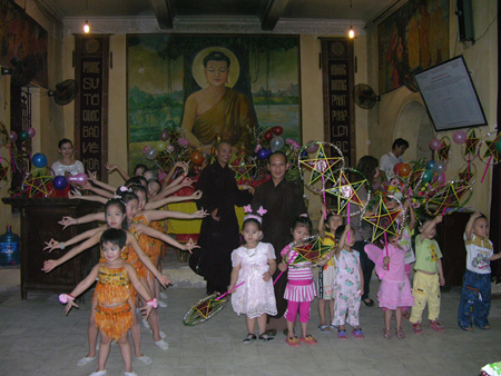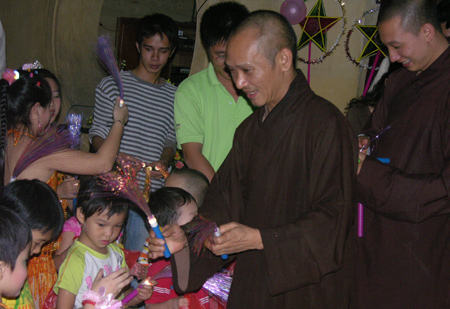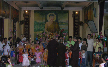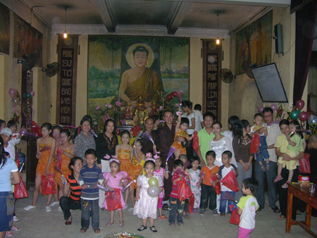 Hoà trong không khí vui tươi, Thượng tọa cùng chư Tăng chùa Quán Sứ, Cở sở liên lạc phát hành báo Giác Ngộ và thành viên website phattuvietnam.net vui liên hoan và trao quà tặng chúc mừng các cháu thiếu nhi.