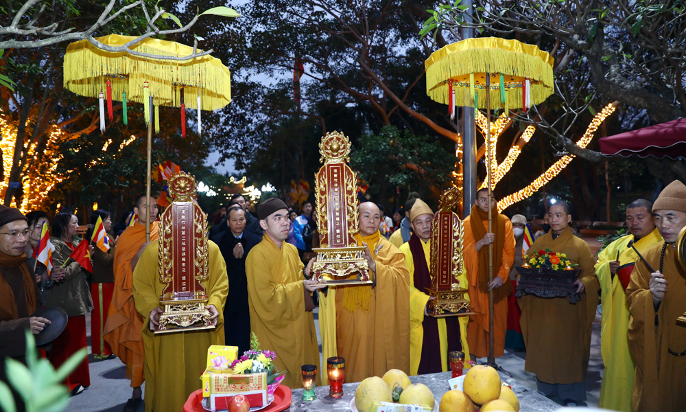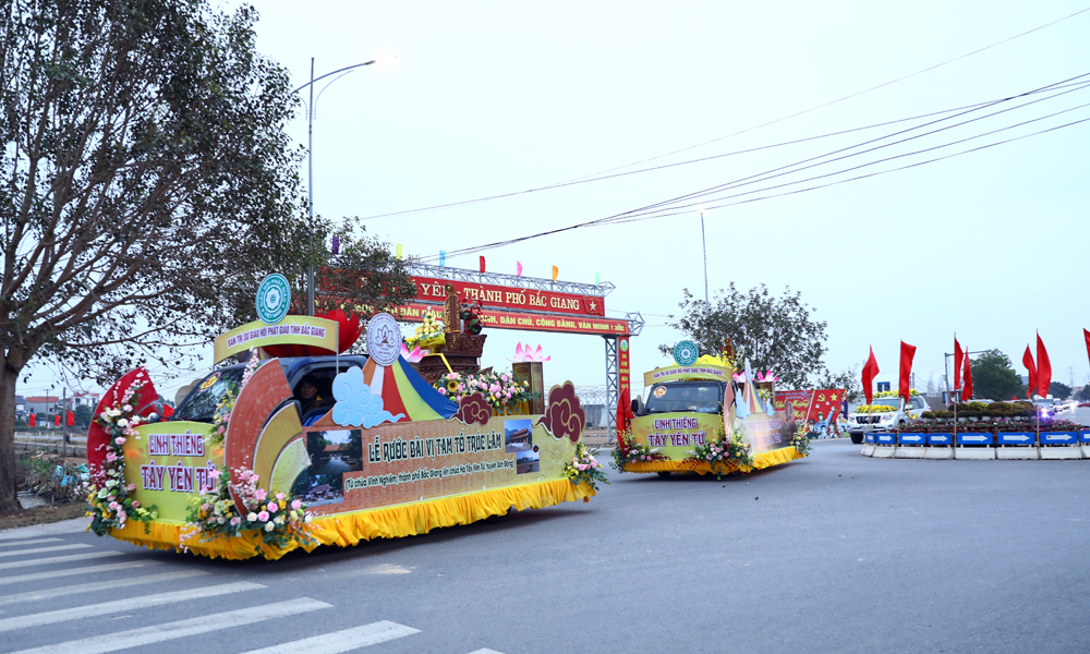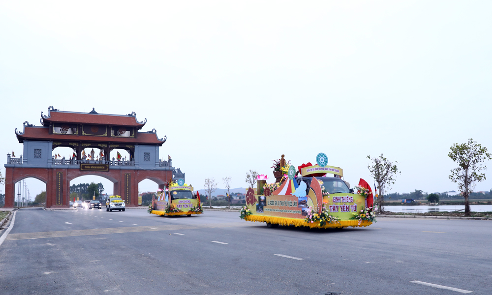 Đoàn rước gồm 51 xe (bằng số tuổi của Phật hoàng Trần Nhân Tông) chở cờ hội, cờ Phật giáo, mâm lễ, bài vị Tam Tổ Trúc Lâm, tăng, ni, phật tử bảo đảm tính tôn nghiêm, trang trọng theo đúng nghi thức Phật giáo. Ba vị Tổ của Thiền phái Trúc Lâm gồm: Tổ đệ nhất là Thượng hoàng, Thiền sư Trần Nhân Tông (1258-1308); Tổ đệ nhị là Thiền sư Pháp Loa (1284-1330); Tổ đệ tam là Thiền sư Huyền Quang (1254-1334). Cả ba vị Tổ đều đi tu và thành đạo ở chùa Vĩnh Nghiêm.