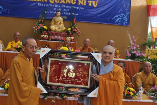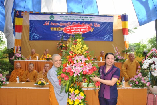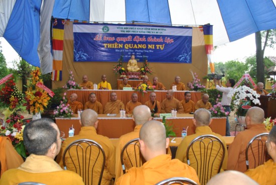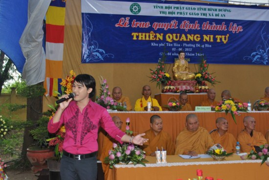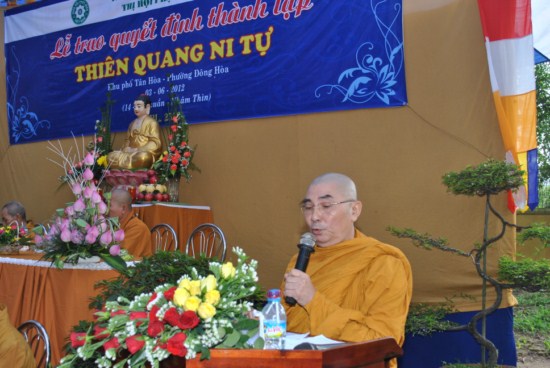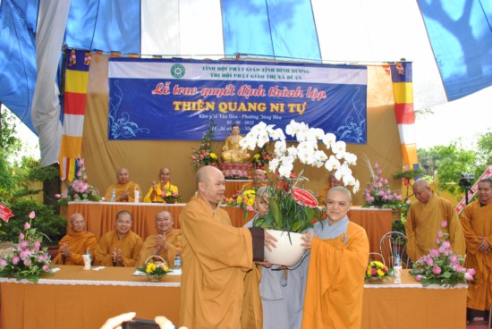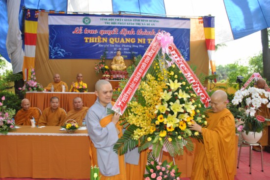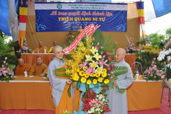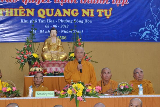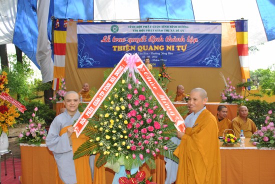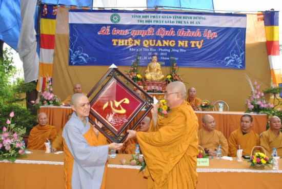 Tại buổi lễ, Đại đức Thích Minh Nghĩa, Chánh thư ký BTS Tỉnh hội đã công bố Quyết định số 79/QĐ-BTS ngày 12-5-2012 của Trưởng BTS THPGBD về việc thành lập Thiên Quang Ni Tự, tọa lạc tại phường Đông Hòa, thị xã Dĩ An.
