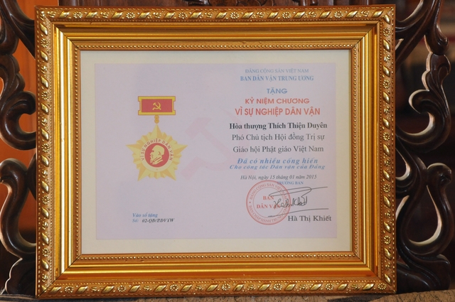 Được biết đợt này, Ban Dân vận T.Ư tặng Kỷ niệm chương “vì sự nghiệp Dân vận”cho 4 vị Trưởng lão Hòa thượng của Giáo hội Phật giáo Việt Nam là: Đức Trưởng lão HT.Thích Phổ Tuệ, Pháp Chủ GHPGVN; HT.Thích Chơn Thiện, Phó Pháp Chủ GHPGVN, Phó Chủ tịch TT HĐTS; HT.Thích Thiện Nhơn, Chủ tịch HĐTS GHPGVN và HT.Thích Thiện Duyên, Phó Chủ tịch HĐTS GHPGVN.