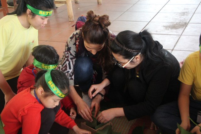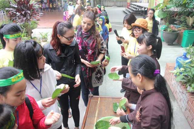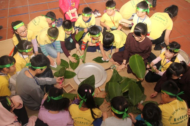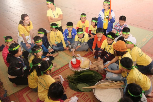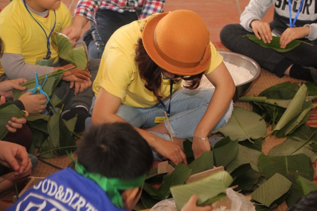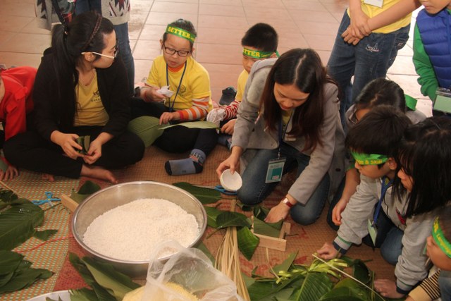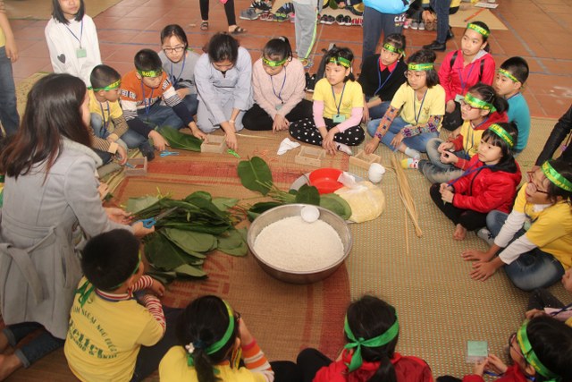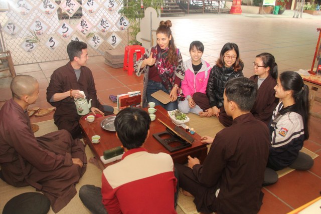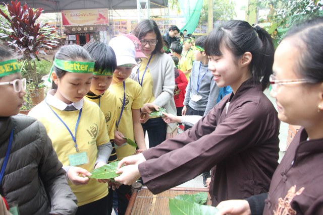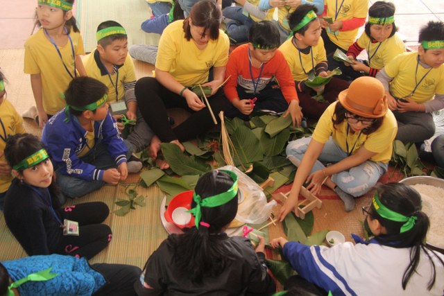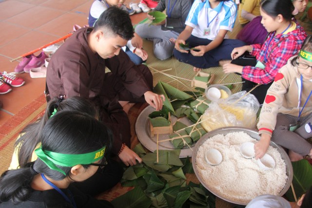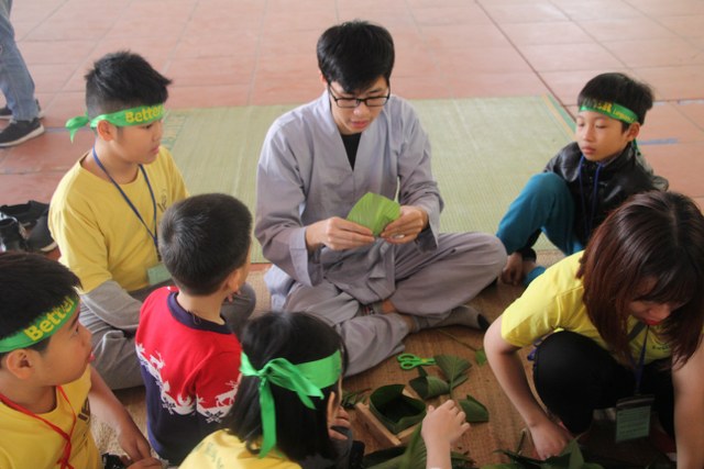 Trong thời gian buổi sáng, các bạn trẻ được các Thầy cô giáo tỉ mỉ hướng dẫn gói bánh chưng chay tại chùa từ việc đơn giản nhất như lau lá, cắt gấp lá. Có lẽ đây là lần đầu tiên các em nhỏ làm quen với công việc này. Sau đó, quý Thầy đã tổ chức cho các bạn làm quen với không khí tu học ở chùa qua nghi thức thiền trà và các bài thiền ca.