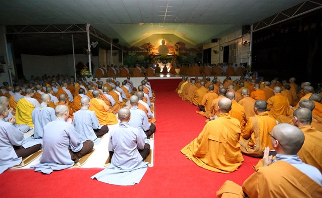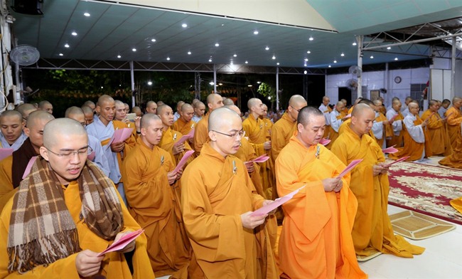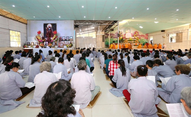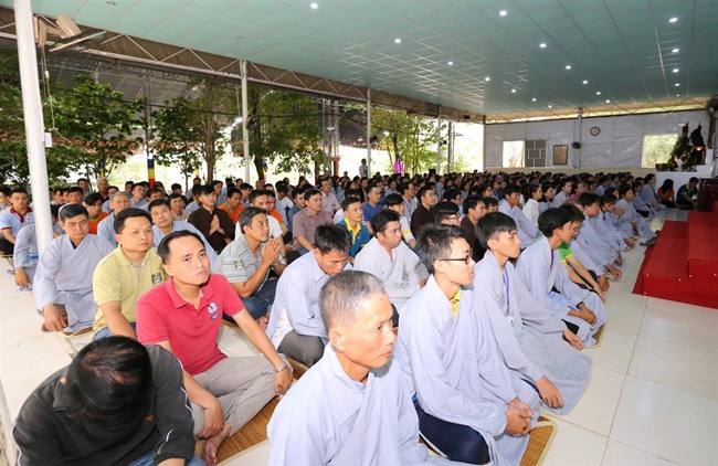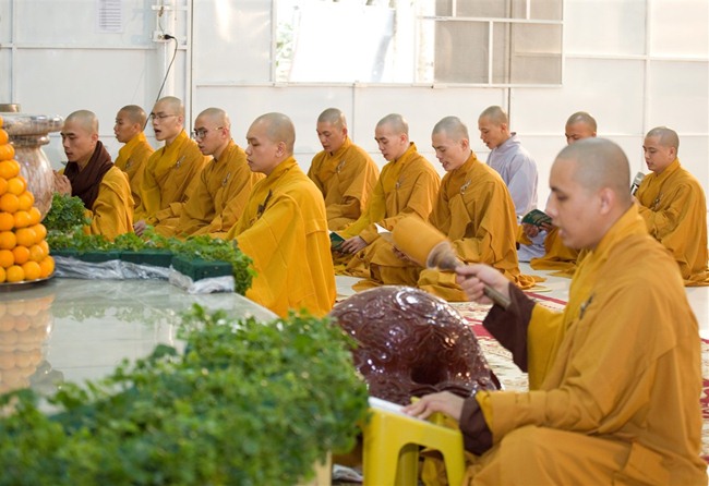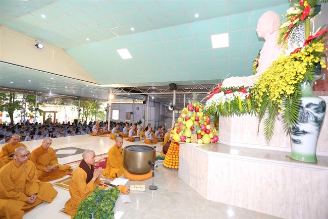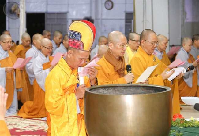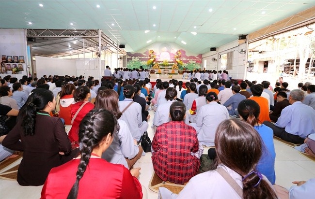 Đúng 9h00” sáng, quý Thầy nơi Bổn tự hướng dẫn phật tử tụng kinh, lạy Phật sám hối, cúng thí thực, tổ chức quy y cho trên 800 phật tử mới.