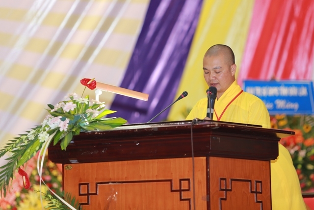 Phát biểu khai mạc đại hội, TT.Thích Quảng Tuấn thành kính cung nghinh Hòa thượng Chủ tịch HĐTS, chư tôn giáo phẩm HĐTS, chư tôn đức BTS các các tỉnh thành bạn về chứng minh đại hội; trân trọng đón tiếp chư vị khách quý đại diện cơ quan nhà nước trung ương và địa phương; hơn 700 đại biểu đến dự đại hội.