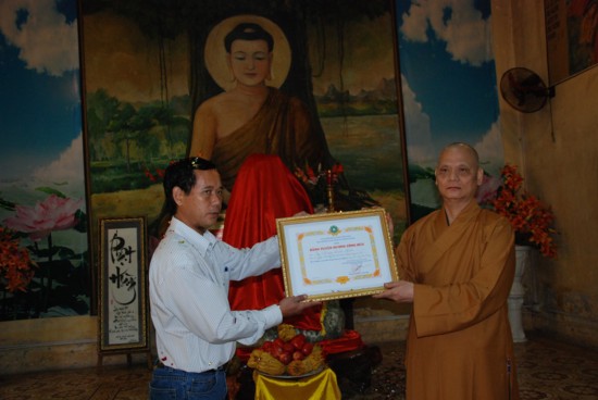 Thượng toạ Thích Thanh Hưng thay mặt văn phòng Ban hướng dẫn Phật tử Trung ương trao tặng bằng tuyên dương công đức của Ban hướng dẫn Phật tử Trung ương tới tác giả Lương Xuân Bình.