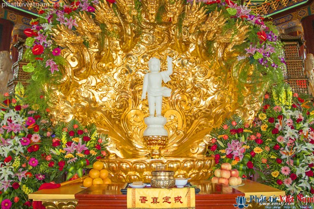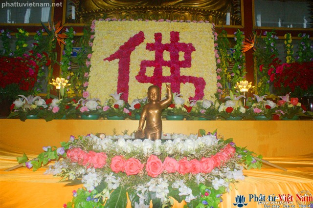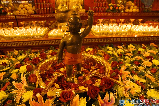 Tương truyền, khi đức Phật đản sinh, Ngài đã đi bảy bước, một ngón tay chỉ trời, một ngón tay chỉ đất, nói: “Trên trời dưới đất chỉ có ta là độc tôn”. Khi nói lời này, đột nhiên trời mưa hoa thơm, chín rồng phun nước tắm cho Thái Tử, trời người hân hoan, khắp thế gian đồng chúc tụng.