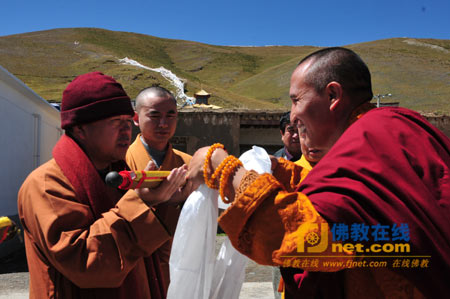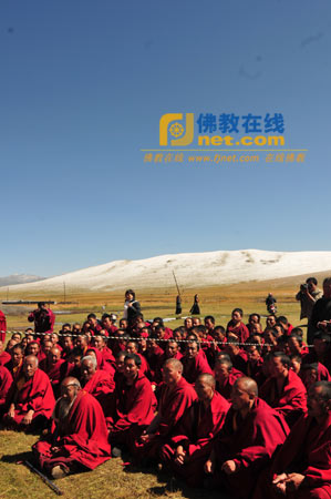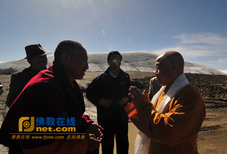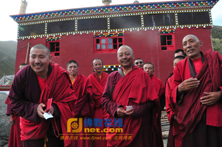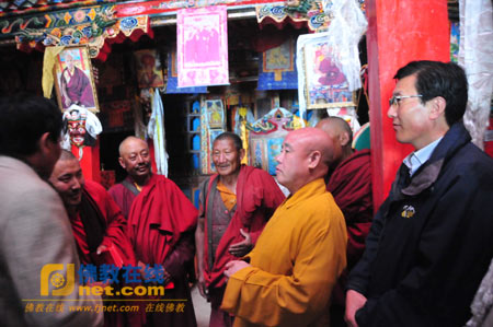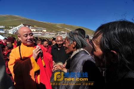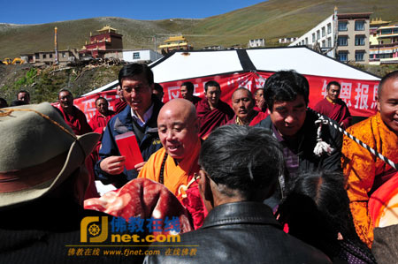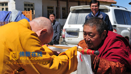 Khoảng 11 giờ trưa, hơn 10 vị tăng dưới sự hướng dẫn của Rinpoche Thành Lâm Giang Thố (Chenglin Jiangcuo), và Phó chủ nhiệm hội quản tự Phổ Đạt Kham Bố (Puda Khenbu) chùa Đương Ca (gọi đủ là damkar lhundrub dechen chokhor ling), đã đứng hai bên đường nghinh tiếp đoàn ủy lạo HHPG TQ. Rinpoche Thành Lâm Giang Thố hiến dâng khăn Bát Bửu Kiết Tường lên phái đoàn, để biểu đạt lòng quý kính và ngưỡng vọng hướng Bắc Kinh cảm tạ thâm ân.