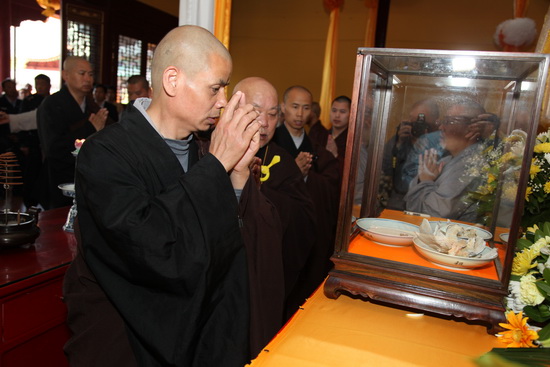 Đúng 9 giờ, để đáp ứng nguyện vọng của đại chúng, các Pháp sư cung thỉnh xá lợi Trưởng lão Tịnh Tuệ vừa phân loại sơ bộ tôn trí tại linh đường cho đại chúng chiêm lễ.