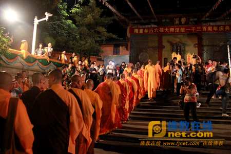 Lúc này, đại chúng cung kính sắp thành hai hàng đông tây, ngọn nến đầu tiên được Hòa thượng Truyền Chánh thắp sáng, sau đó dần dần truyền đến đại chúng. Hàng đệ tử tăng tục đồng loạt xướng niệm Phật hiệu “Nam Mô Bổn Sư Bổn Sư Thích Ca Mâu Ni Phật”, tay cầm ngọn nến quang minh, im lặng cầu nguyện, từ từ đi nhiễu nghinh tiếp Pháp y Lục Tổ. Từng ngọn, rồi từng ngọn minh đăng, đã hình thành một biển đèn lưu động sáng chói vô cùng ngoạn mục, đây cũng là tượng trưng trí tuệ của Lục Tổ giống như hàng vạn ngọn minh đăng, đèn đèn vĩnh viễn tương truyền, trải dài không dứt.