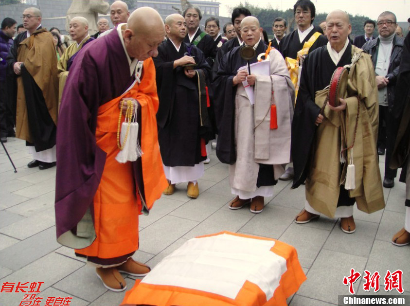 Nam Kinh, rạng sáng ngày 13, bầu trời u ám, gió rét cắt da, chư tăng các tự viện chùa Diệu Âm, chùa Đông Bổn Nguyện – phái Chân Tông Đại Cốc Nhật Bản, cùng chư tăng các tự viện: Thê Hà, Long Tuyền, Linh Cốc, Kê Minh, Tỳ Lô… tại Nam Kinh, mọi người đều túc nhiên cử hành pháp hội, xướng tụng kinh văn trước “Khốc Tường” – nhà Kỷ niệm Đồng bào bị thảm sát tại Nam Kinh bởi quân Nhật Bản – một hình thức độc đáo của tôn giáo, như ký thác lời chia buồn sâu sắc đến với các nạn nhân chiến tranh.