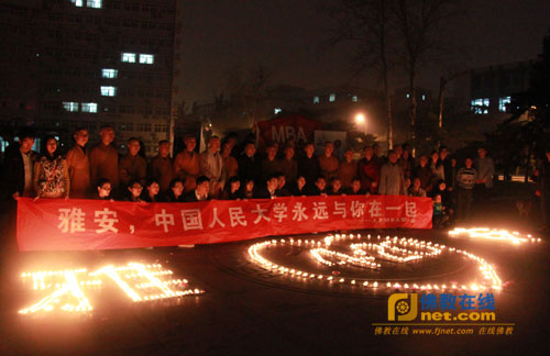 8 giờ 2 phút đêm 22/4, Toàn thể các Pháp sư sinh viên năm thứ 2 thứ 3 lớp Nghiên cứu sinh Thạc sĩ chuyên nghiệp Văn hóa Phật giáo Tôn giáo học trường Đại học Nhân dân Trung Quốc, và Hội Liên hiệp MBA (Master of Business Administration) Trường Đại học Quản trị Kinh doanh, cùng tổ chức hoạt động thắp nến cầu nguyện cho nhân dân bị thiên tai, siêu tiến các hương linh trong trận động đất ở Nhã An, Tứ Xuyên với tiêu đề “Kỳ Phước – Nhã An”, “Nhã An, chúng ta cùng đứng lên”. Hiện trường còn có rất nhiều sinh viên tự nguyện đến tham gia vào hoạt động cầu nguyện.