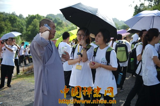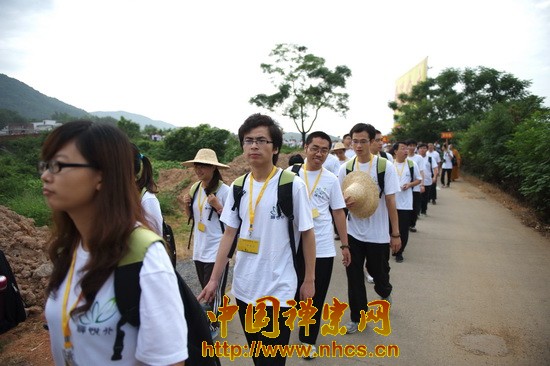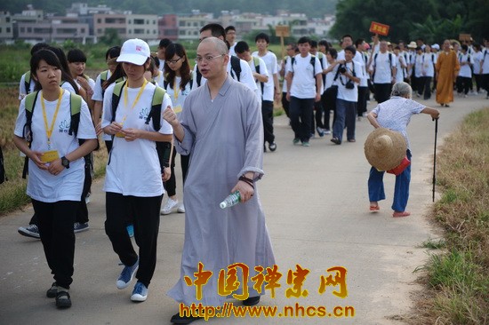 7 giờ 10, tất cả trại viên tập họp tại vườn Tức Tâm – Thiền tự Nam Hoa, sau đó xếp hàng theo từng tổ, ngay ngắn trật tự chuẩn bị xuất phát. Lộ trình hành khước chia làm hai đoạn tiểu lộ và sơn lộ (nông thôn và hương thôn), con đường tương đối dài, lại gập ghềnh khúc khuỷu, nhưng các trại viên đều mang trong lòng trái tim kiền thành vui vẻ hướng về phía trước. Trong quá trình hành khước, các trại viên không quên khám phá tìm tòi ý nghĩa hành khước, vừa đi vừa giao lưu học hỏi với các Pháp sư phụ đạo. Khoảng 9 giờ đã đến Thánh tích ty nạn thạch.