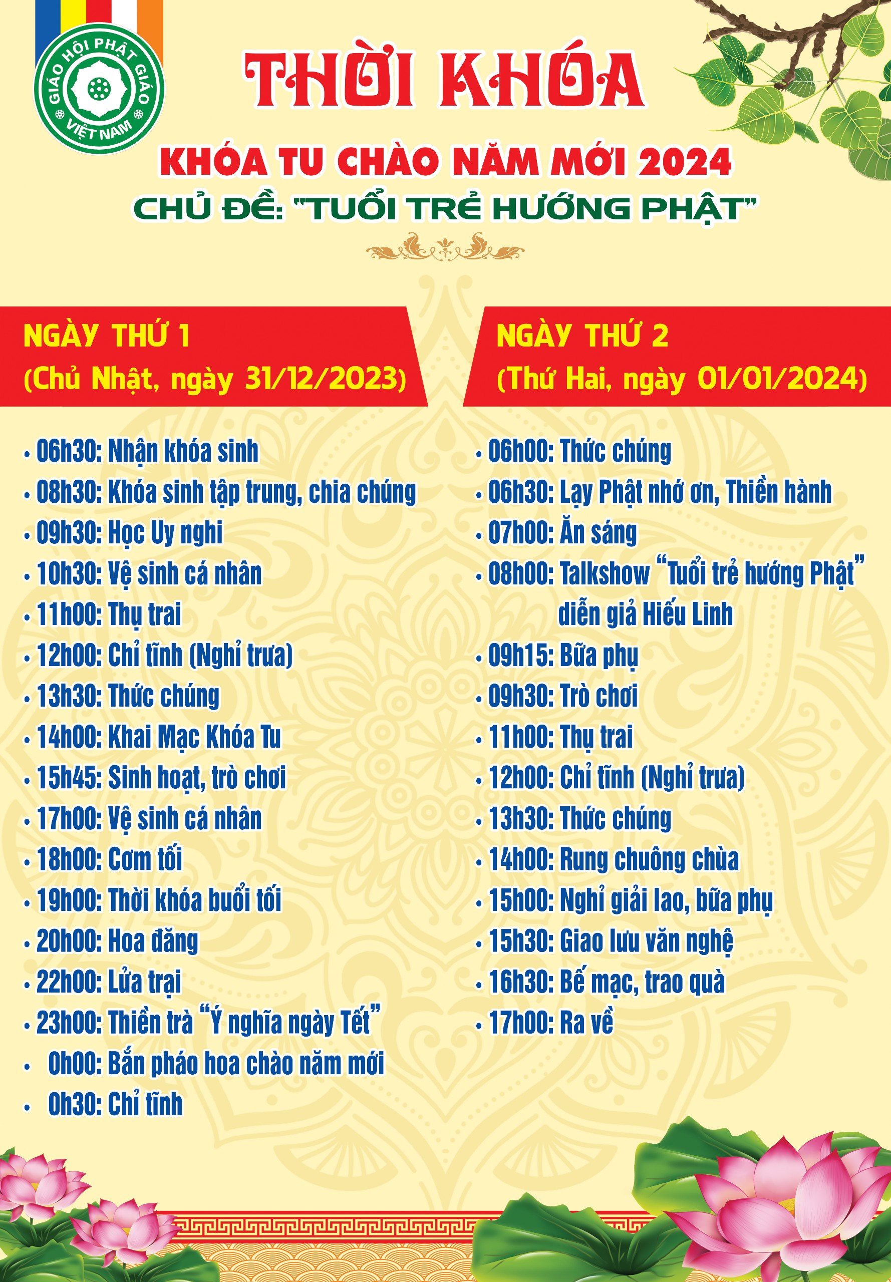 Khóa tu “Tuổi trẻ hướng Phật, Chào năm mới 2024” do Ban HDPT tỉnh Nam Định tổ chức lần thứ nhất đã bước vào giai đoạn cuối của công tác chuẩn bị, về mọi mặt đã gần như hoàn tất. Khóa tu Chào năm mới 2024 chủ đề “Tuổi trẻ hướng Phật” diễn ra trong thời gian hai ngày 31/12/2023 – 01/01/ 2024 chắc chắn sẽ mang đến cho các bạn trẻ tham dự nhiều điều lợi ích và thú vị bất ngờ.