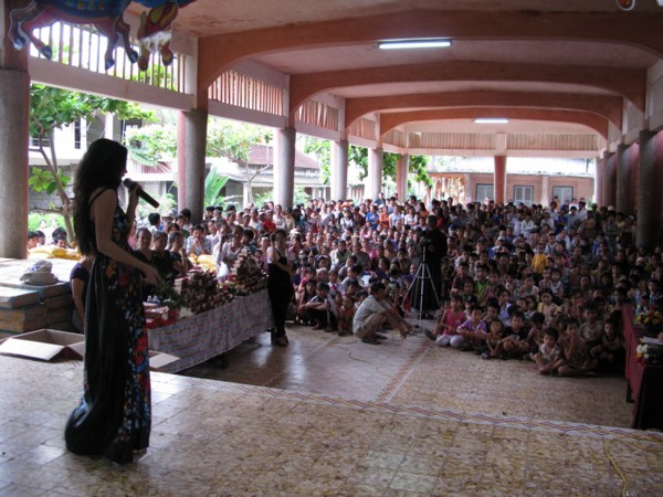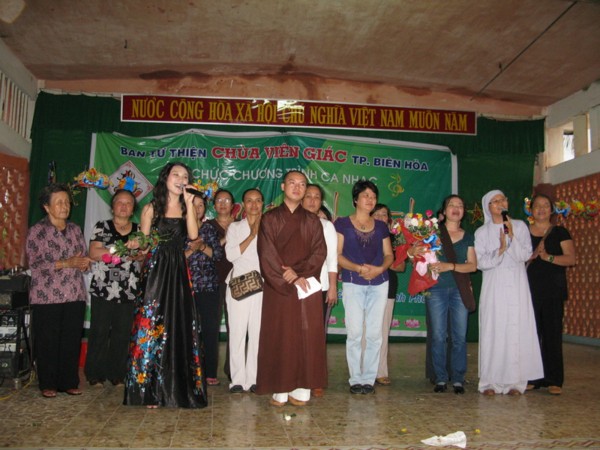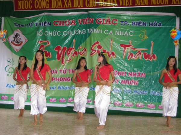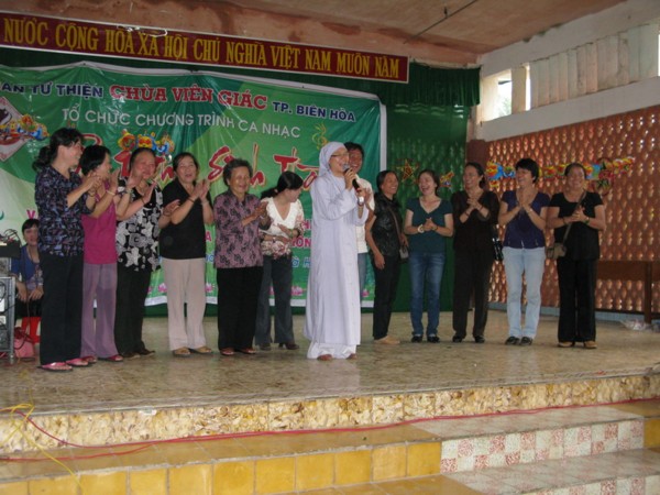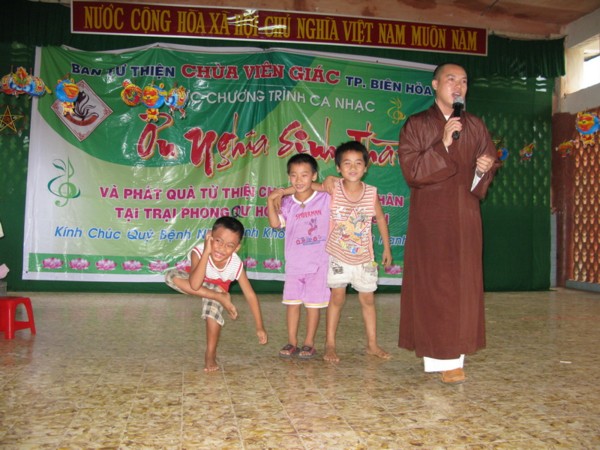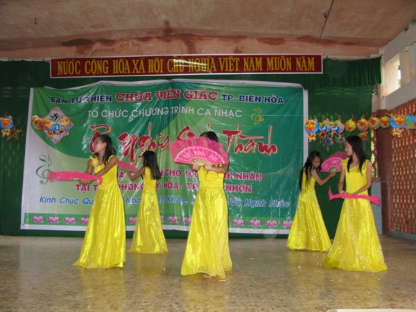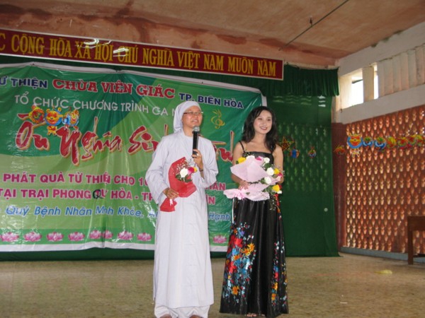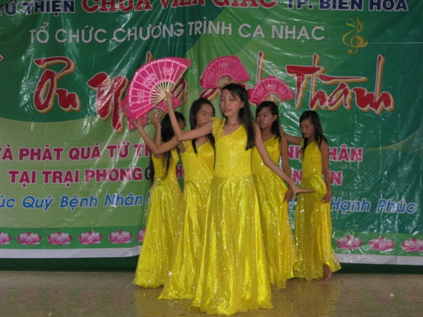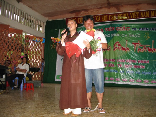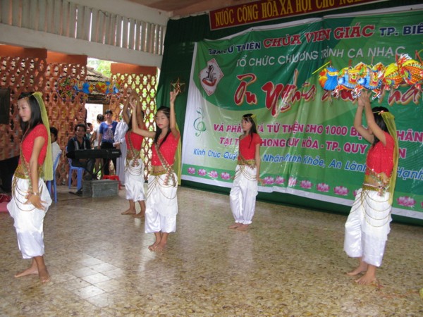 Buổi giao lưu văn nghệ thật sinh động, sôi nổi dưới sự dẫn đắt của sư cô Thích Nữ Diệu Tấn, ca sỹ kiêm diễn viên điện ảnh Mỹ Kim, ĐĐ. Thích Thiện Mỹ – trú trì chùa Viên Giác – Biên Hòa và nhóm múa đội văn nghệ thiếu nhi bệnh viện Phong Qui Hòa.