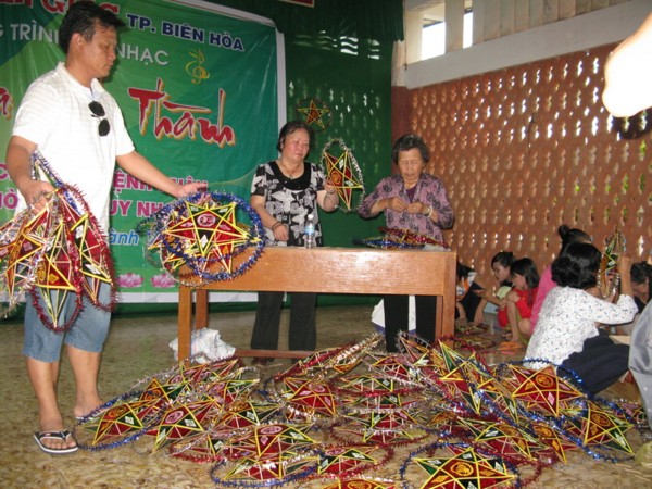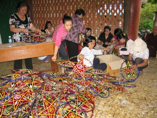 Lặng lẽ ngồi xếp lại từng cái lồng đèn, từng chiếc bành trung thu…, các cô bác trong Ban Từ Thiện Thiền Viện Vạn Hạnh thành phố Đà Lạt như vui lây với niềm vui của các em mừng đón tết chị Hằng.
