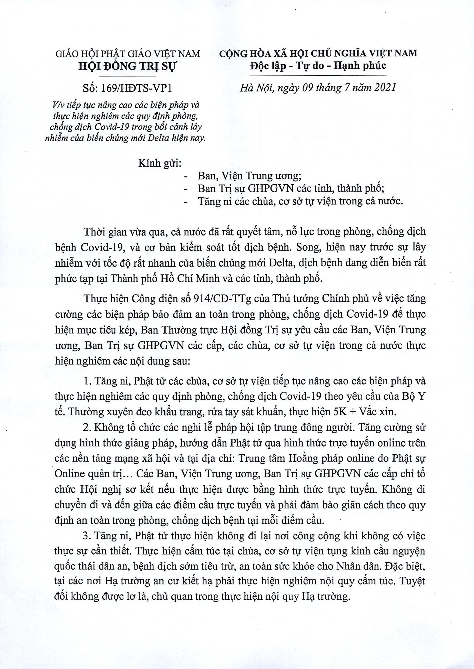 Hội đồng Trị sự GHPGVN vừa phát hành Công văn số 169/HĐTS-VP1, ra ngày 9/7/2021 về việc tiếp tục nâng cao các biện pháp và thực hiện nghiêm các quy định phòng, chống dịch Covid-19 trong bối cảnh lây nhiễm của biến chúng mới Delta hiện nay.