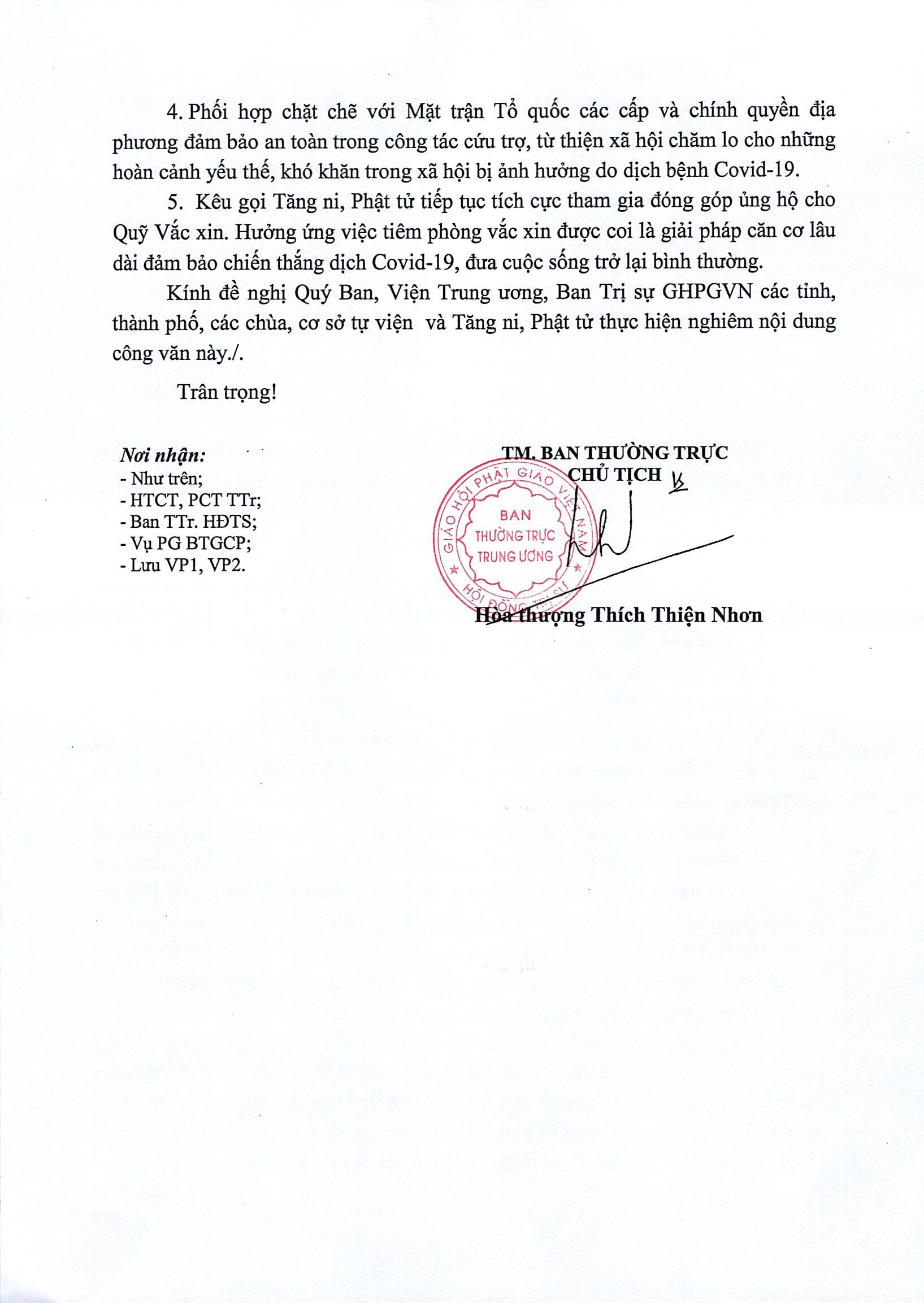 - Kêu gọi Tăng ni, Phật tử tiếp tục tích cực tham gia đóng góp ủng hộ cho Quỹ Vắc xin. Hưởng ứng việc tiêm phòng vắc xin được coi là giải pháp căn cơ lâu dài đảm bảo chiến thắng dịch Covid-19, đưa cuộc sống trở lại bình thường.