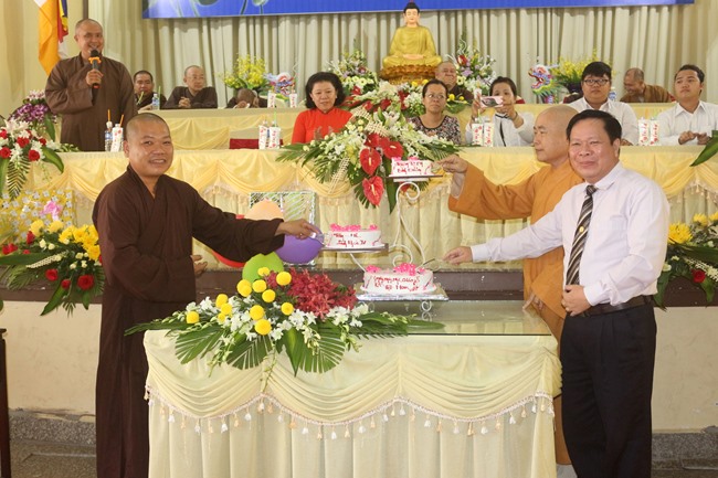 Tiếp nối chương trình HT.Thích Viên Giác, TT.TS.Thích Chơn Phát và ông Trần Đức Thịnh cắt bánh kem chúc mừng Ngày Nhà giáo Việt Nam 20/11.