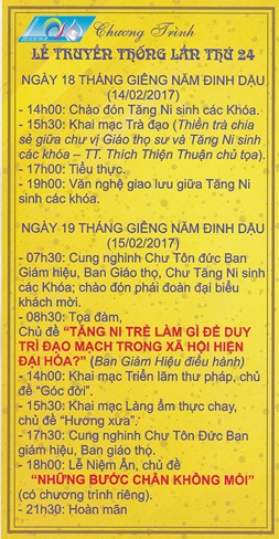*Ghi chú: Xin lưu ý, nếu quý Thầy-Cô hướng dẫn phái đoàn Phật tử hoặc những phái đoàn Phật tử các nơi về tham dự Lễ Truyền Thống, xin vui lòng liên hệ trước để BTC sắp xếp tiếp đón chu đáo hơn (chậm nhất là ngày 15 tháng Giêng năm Đinh Dậu – nhằm ngày 11/02/2017 ). Xin liên hệ: 0934950677 gặp thầy Thanh Hùng.