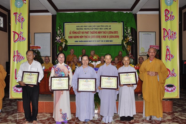 Vinh danh và khích lệ các Tăng Ni sinh học tập tốt, Ban Giám hiệu đã dành 6 phần thưởng xuất sắc và hạnh kiểm cho các Tăng sinh tại cơ sở 1 như: Ts.Tâm Thành (hạng nhất), Ts. Nguyên Phát (hạng nhì), các hạng tiếp theo là: Bửu Minh, Thiện Quang, Đức Chơn, Thiện Hưng, do HT. Hiệu trưởng Thích Minh Thiện và TT. Thích Minh Thọ trao tặng.