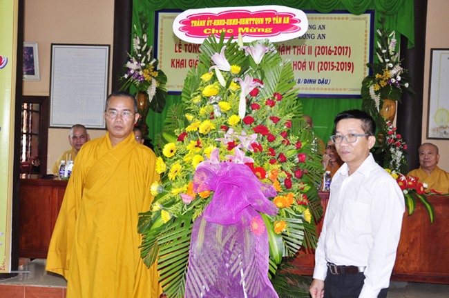 Ngoài ra, Ban Giám hiệu còn trân trọng đón các lẵng hoa từ đại diện khách quý chính quyền Ban Dân Vận, Ủy ban Mặt trận Tổ quốc, do Công Hoàng Bạch, ông Nguyễn Hoàng Phương trao tặng. HT. Thích Minh Thiện và TT. TT. Minh Thọ đón nhận đại diện Ban Giám hiệu hoan hỷ tiếp nhận.