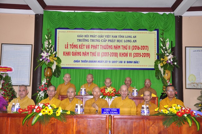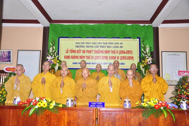 Đúng 8g30, Lễ Tổng kết và Khai giảng năm học mới chính thức bắt đầu, Đại đức Thích Lệ Trí – Chánh thư ký BTS GHPGVN – Phó hiệu trưởng Trường Trung cấp Phật học Long An điều phối chương trình, đại diện cung thỉnh chư Tôn đức Giáo phẩm, các cấp chính quyền, Ban bảo trợ thân lâm hội trường chứng minh.