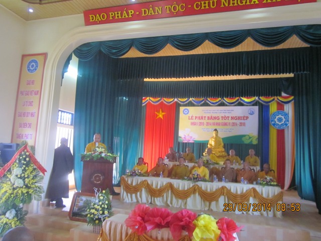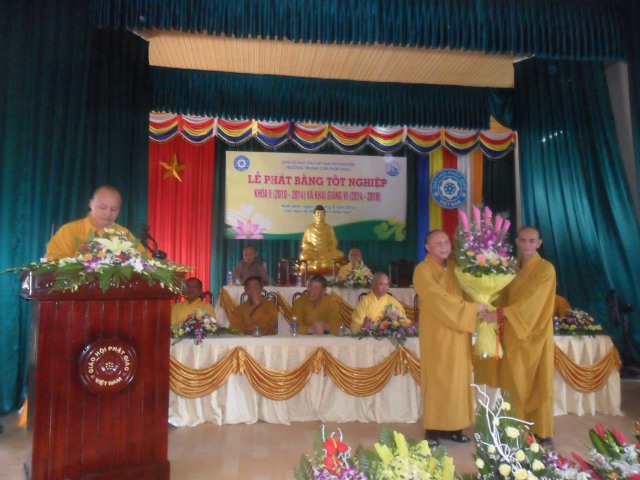 Sau đó, quý tôn đức, đại biểu đã có những lẵng hoa chúc mừng nhà trường và các tân cử nhân. TT.Thích Quảng Hà thay mặt cho BGH nhà trường lên tuyên đọc báo cáo tổng kết khóa học.