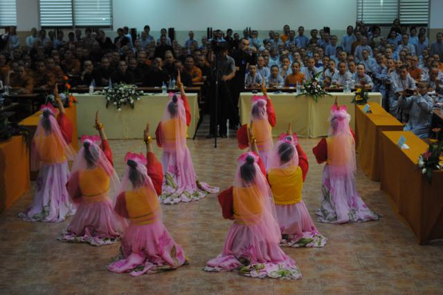 Sau phần niệm Phật cầu gia bị, đạo ca, phút mặc niệm, tiết mục mở đầu là Dâng Hoa Cúng Dường do ni sinh khóa VII thể hiện đã tạo nhiều xúc cảm thiêng liêng sâu đậm tình thầy trò.