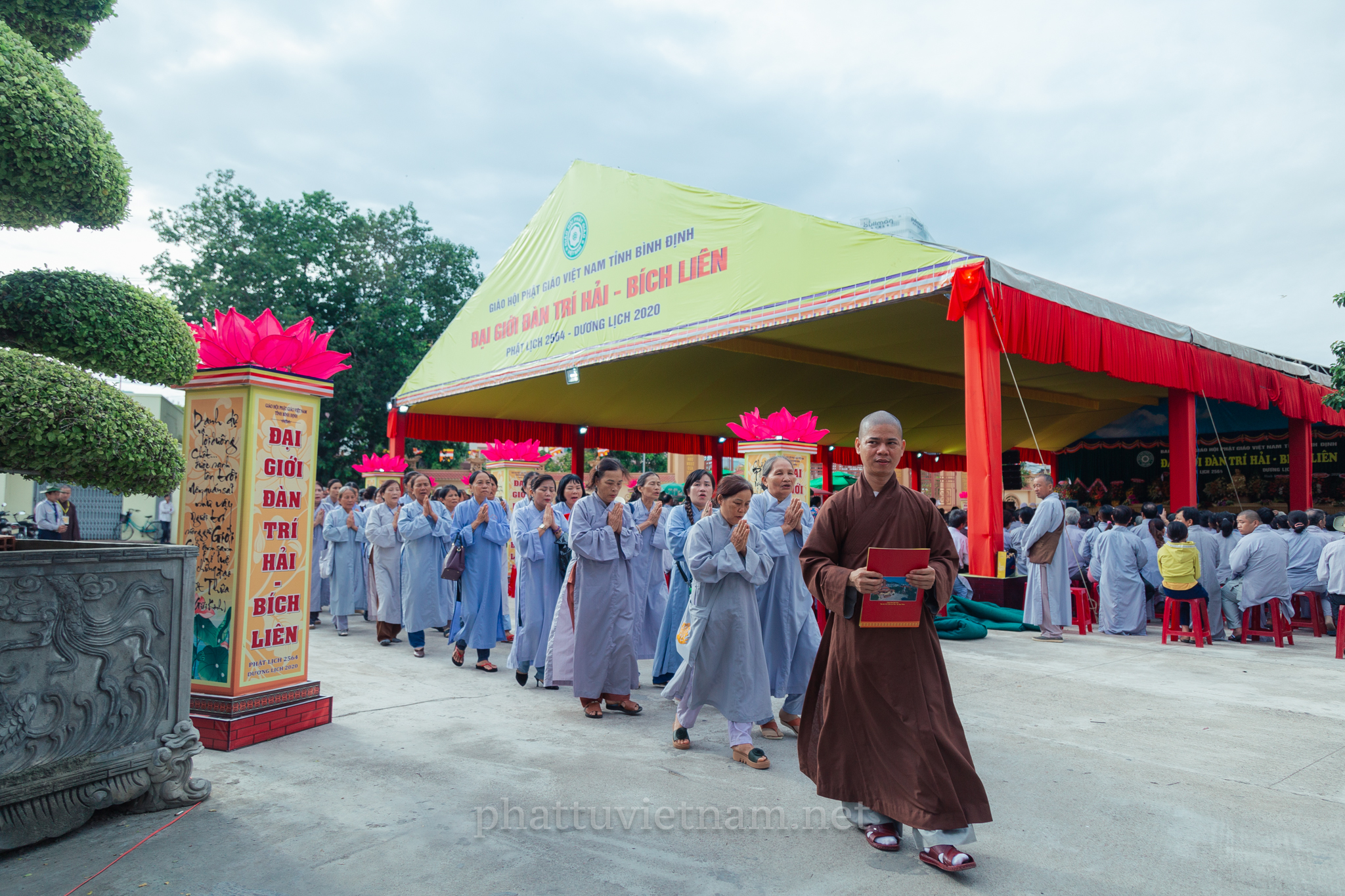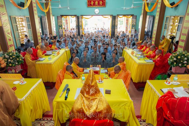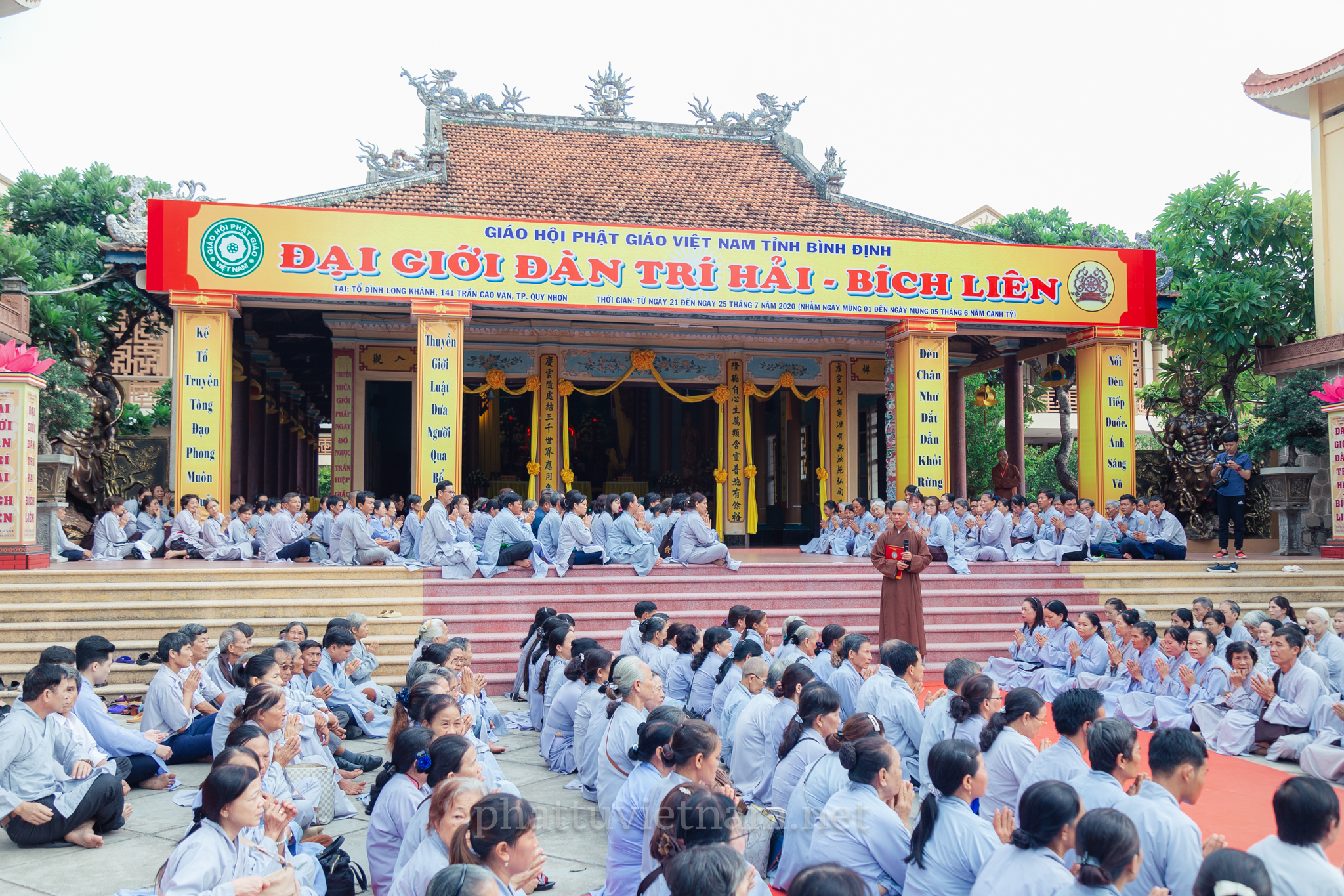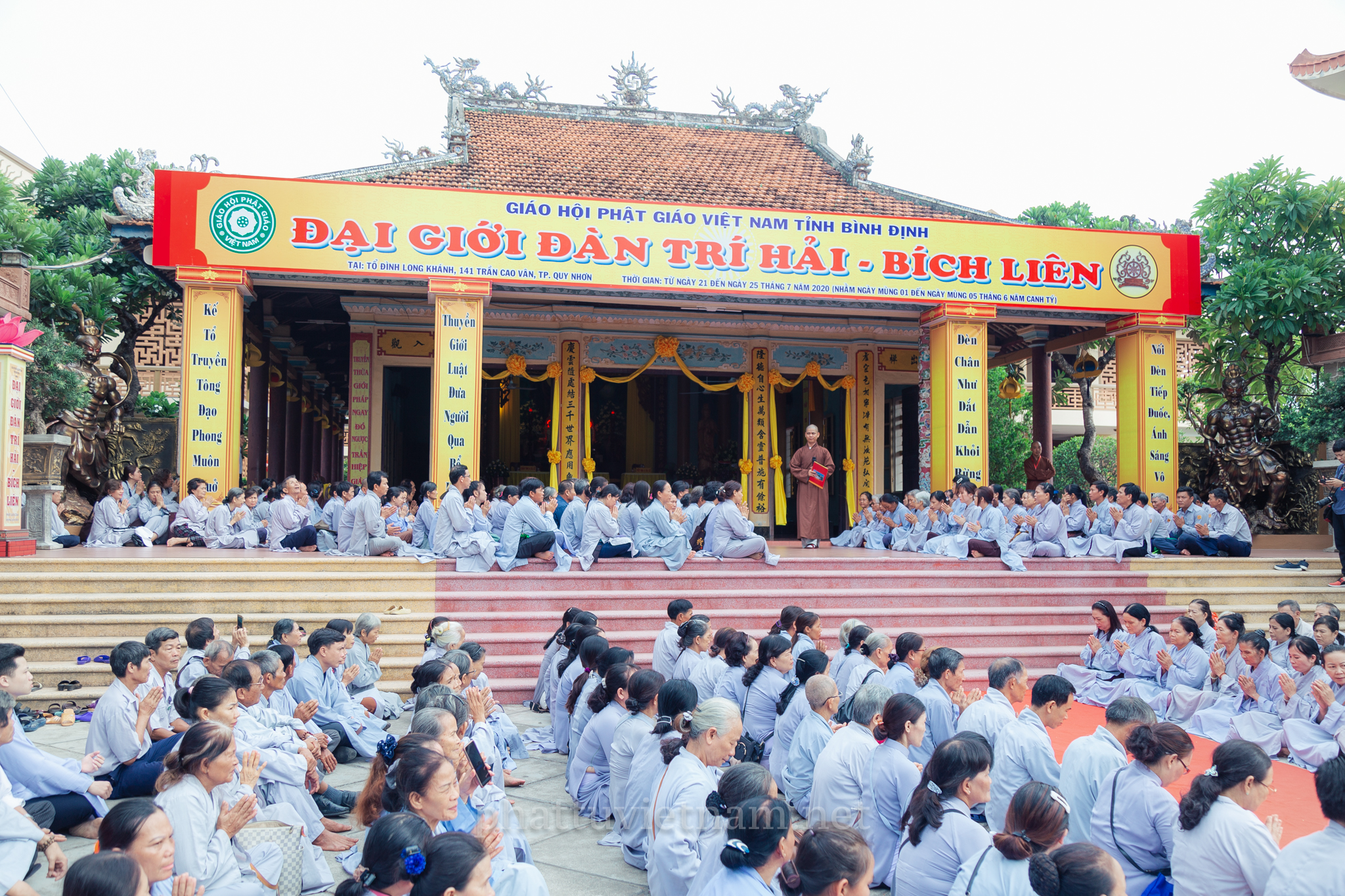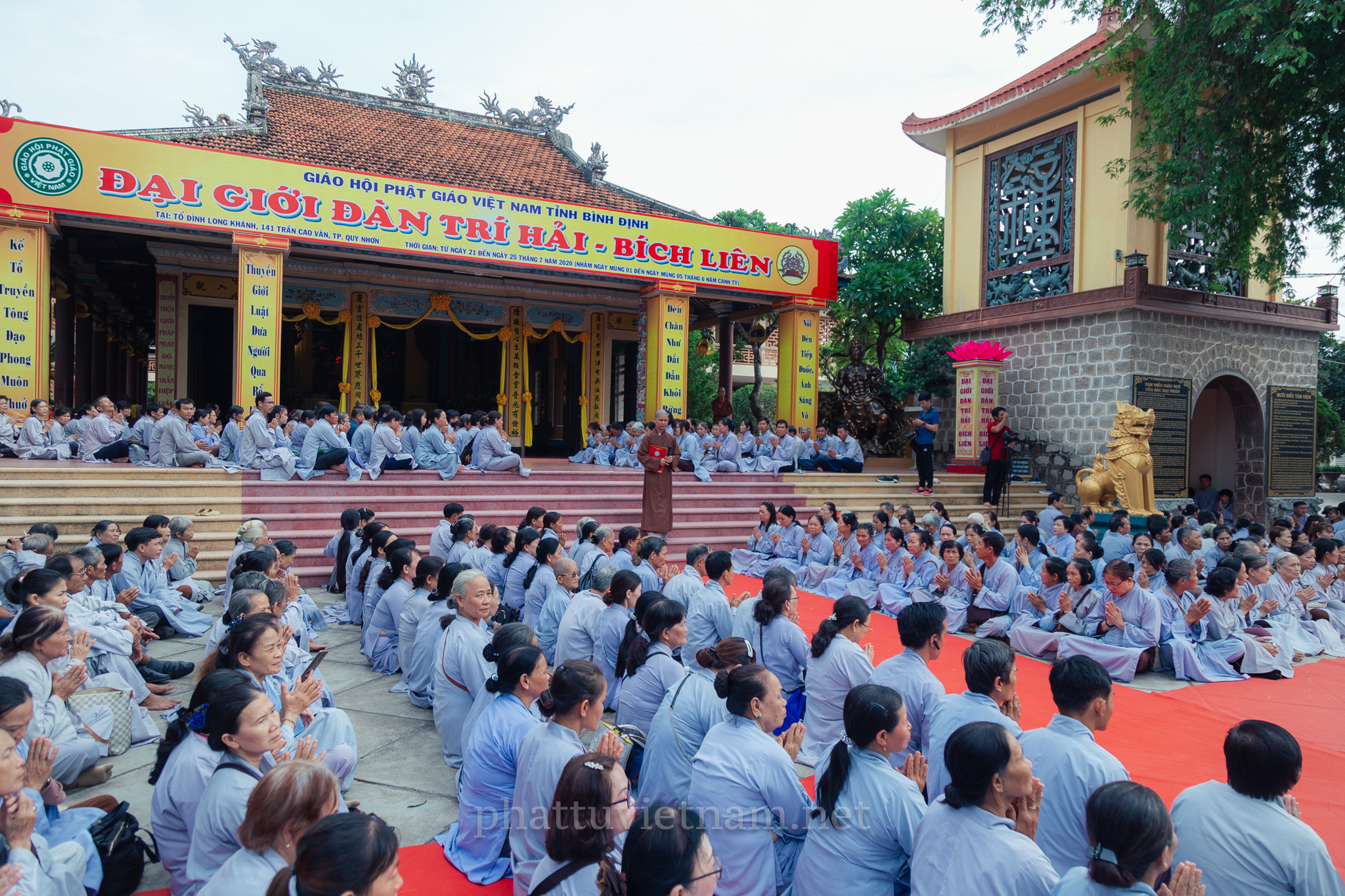 PTVN – Sáng ngày 24/7/2020 (nhằm ngày 4/6/Canh Tý), vào lúc 8 giờ tại Đại giới trường Tổ đình Long Khánh (số 141 Trần Cao Vân, TP.Quy Nhơn) toàn thể Giới tử tại gia đã vân tập trang nghiêm cung thỉnh chư Tôn đức Hội đồng Thập sư Đại giới đàn Trí Hải – Bích Liên cử hành lễ Tấn đàn thọ giới Thập thiện và Bồ tát tại gia.