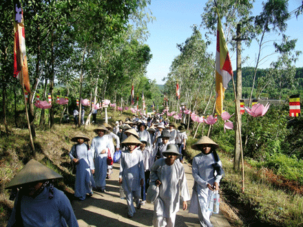 Chúng tôi thấy hàng trăm chiếc xe mang biển số từ các tỉnh Hà Nội, TP.HCM, Nha Trang, Hà Tây, Đà Nẵng, Nghệ An, Quảng Trị, Savannakhet, Chămpasak, Viên Chăn Lào… chở đầy khách hành hương trong trang phục lam và nâu truyền thống đã quy tụ về chân núi Tứ Tượng để chiêm bái và dự hội.