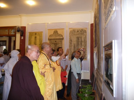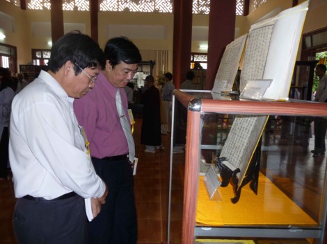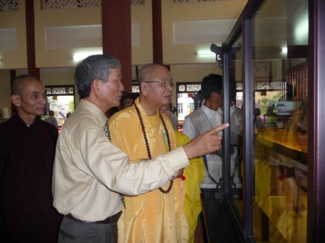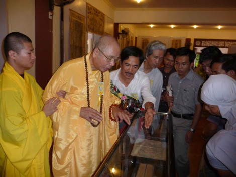 Nhà nghiên cứu Trần Đình Sơn giới thiệu các hiện vật tại triển lãm với HT. Thích Đức Phương