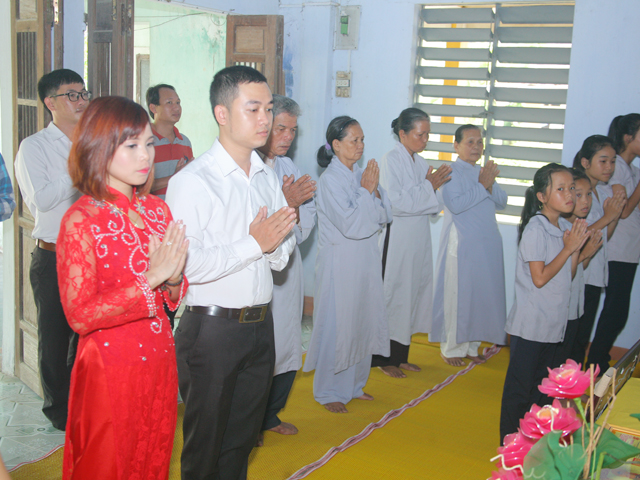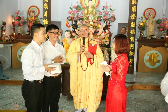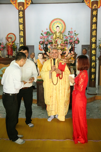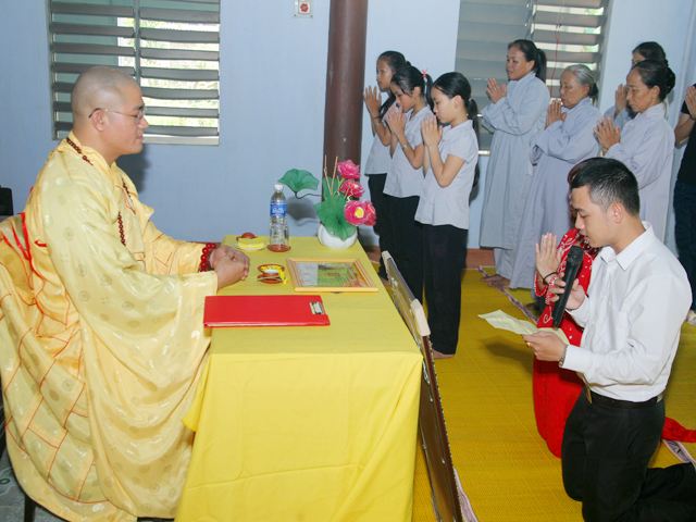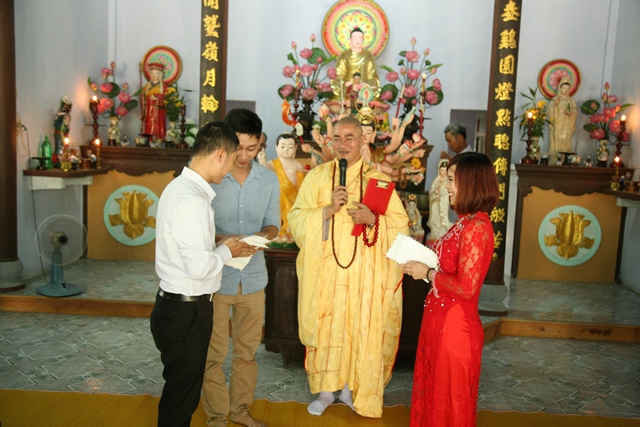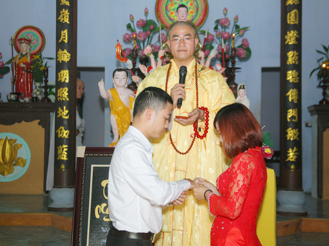 Đối trước Tam bảo, hai chúng con xin thành tâm phát nguyện: Dẫu cuộc đời có gặp khó khăn thử thách, chúng con cũng đồng lòng đồng cam cộng khổ, trên thuận dưới hòa sống trọn đạo làm con và bổn phận của người con Phật. Chúng con luôn tôn trọng nhau, thành thật và thủy chung yêu thương nhau trọn đời, để khỏi phụ công ơn sanh thành giáo dưỡng và niềm tin yêu của cha mẹ hai bên cũng như tỏ lòng tri ân đến Tam bảo và Sư phụ, chúng con nguyện phụng đạo giúp đời, làm người công dân tốt trong xã hội.
