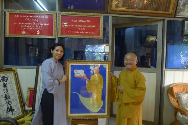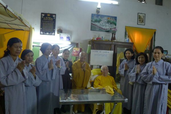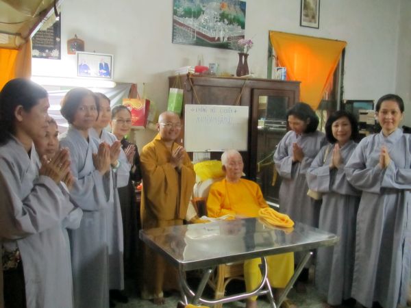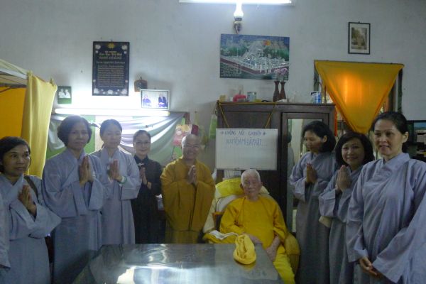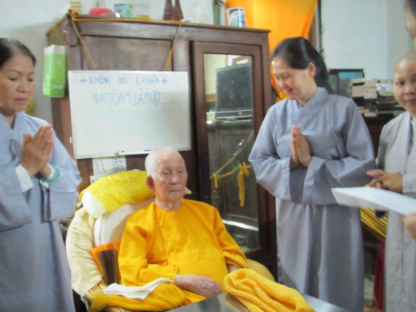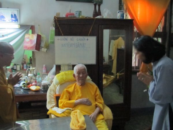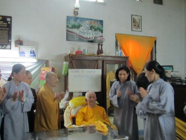 TT. Nhật Từ dẫn cả phái đoàn vào lễ Phật, cúng dường Tam bảo, lễ phẩm cho chư tăng. Sau đó, được sự hướng dẫn của Thượng tọa Tri sự lên đảnh lễ Hòa thượng. Đã lâu lắm rồi, cách đây một vài năm mới có dịp lên thăm Người. Vẫn căn phòng đó, chiếc bàn kia, cái ghế mây không bao giờ thay đổi. Nhưng, khoảng khắc ấy ấm cúng lạ thường. Mọi sinh hoạt dường như khựng lại, chỉ còn lại hơi thở, niềm tôn kính hướng về Người.